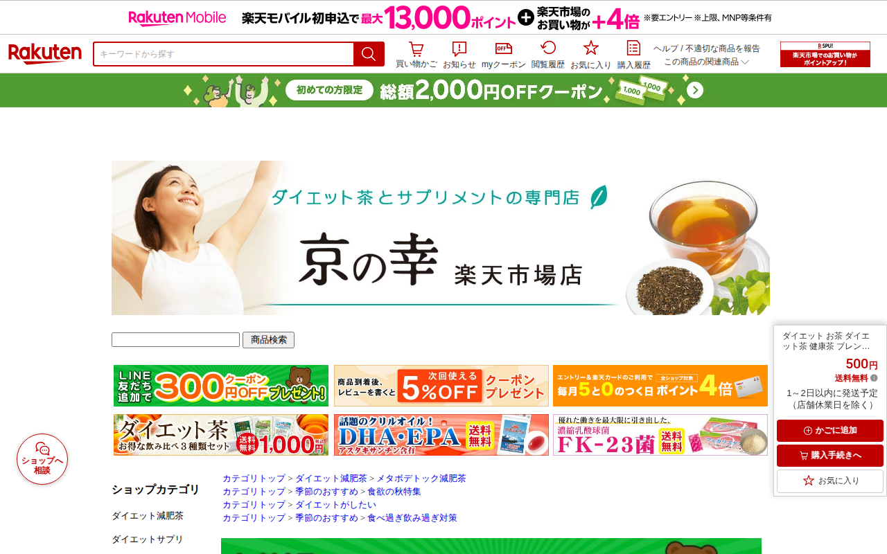 このページは、楽天市場で販売されているダイエットコーヒー「すらりっと珈琲」の商品ページです。100g入りで1,860円から4,150円(まとめ買い割引あり)の国産ダイエット飲料で、送料無料です。毎日飲むコーヒーをこれに替...