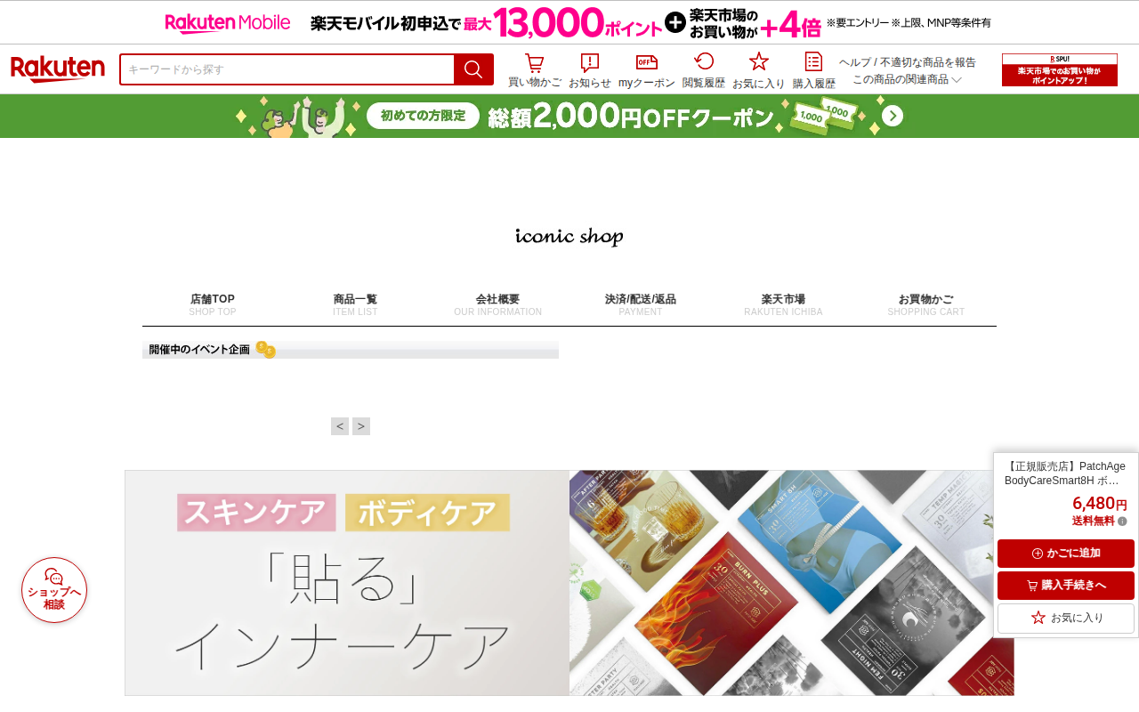 このページは、楽天市場で販売されているPatchAge BodyCareSmart8Hという貼るタイプのダイエットサプリメントの商品情報ページです。30枚入りで6,480円、送料無料で販売されています。米国の医師が推奨す...
