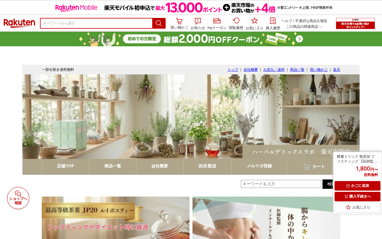 このページは、楽天市場で販売されている医師監修の無添加酵素ドリンク「ハーバルクレンズ酵素」の商品紹介ページです。初回購入者限定で50%割引が適用され、分包9包が1,800円、720ml瓶が7,450円で購入できます。3年...