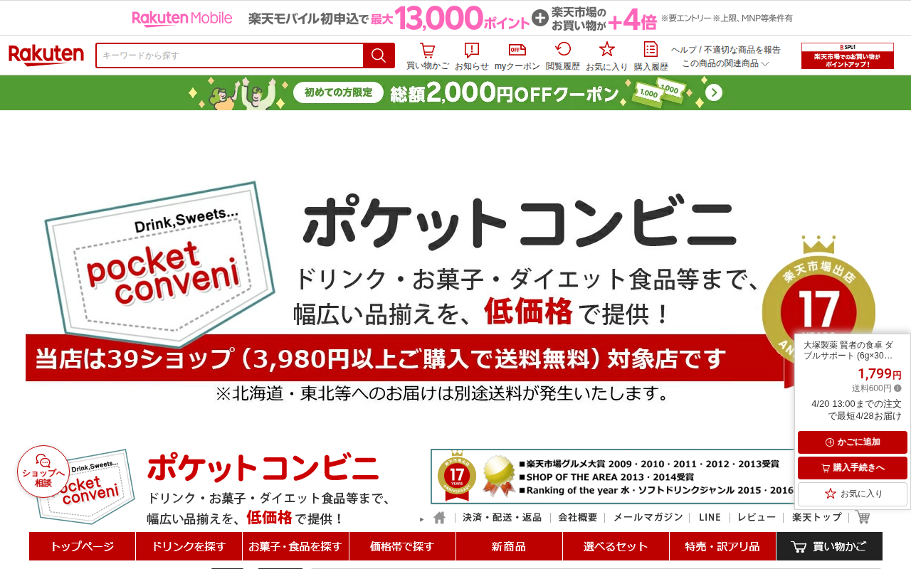 このページは、楽天市場で販売されている大塚製薬の「賢者の食卓 ダブルサポート」の商品ページです。6g×30包入りで約10日分の特定保健用食品(トクホ)で、糖分や脂肪の吸収を抑える効果があります。価格は1,799円で送料は...