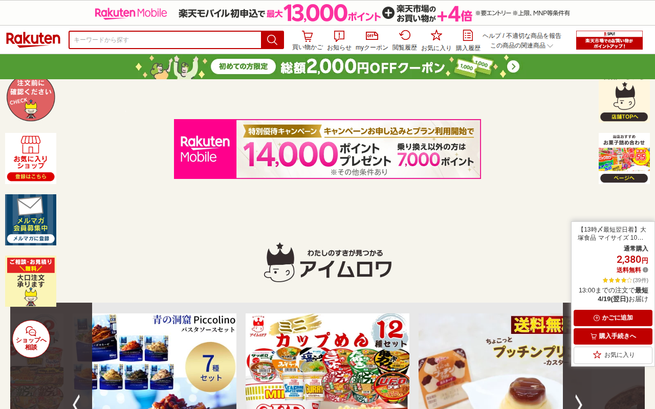 このページは、楽天市場で販売されている大塚食品の「マイサイズ」レトルト食品10種類のセット商品です。価格は2,380円で送料無料。13時までの注文で翌日配送可能。カレー、ハヤシ、親子丼、中華丼など10種類の惣菜が含まれて...
