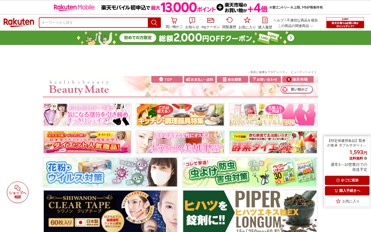 このページは、楽天市場で販売されている大塚製薬の「賢者の食卓ダブルサポート」の商品ページです。難消化性デキストリンを主成分とする食品で、飲み物に溶かすだけで使用できます。糖分や脂肪の吸収を抑え、食後の血糖値と中性脂肪の上...