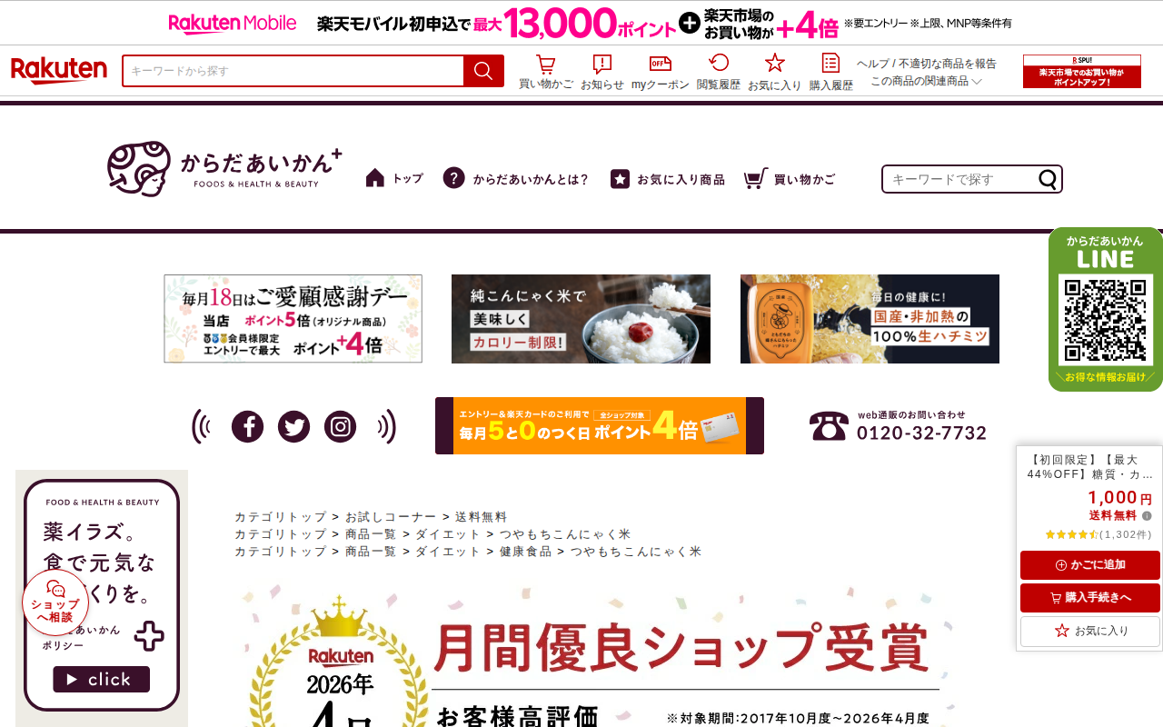 このページは、楽天市場で販売されている「つやもちこんにゃく米」の初回限定お試しセットの商品ページです。糖質・カロリーを30%カットできるこんにゃく米で、1,000円送料無料の初回限定価格で提供されています。お米に混ぜて炊...