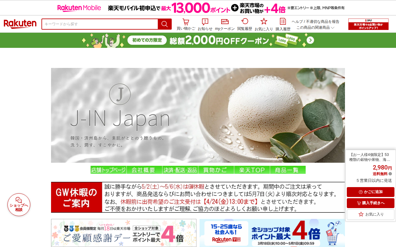 このページは、楽天市場で販売される韓国製の穀物飲料「ZEN49+SUPER PREMIUM RICH」の商品ページです。53種類の穀物、果実、海産物を含む粉末で、1箱18g×20包、価格は2,980円(送料無料)。お一人...