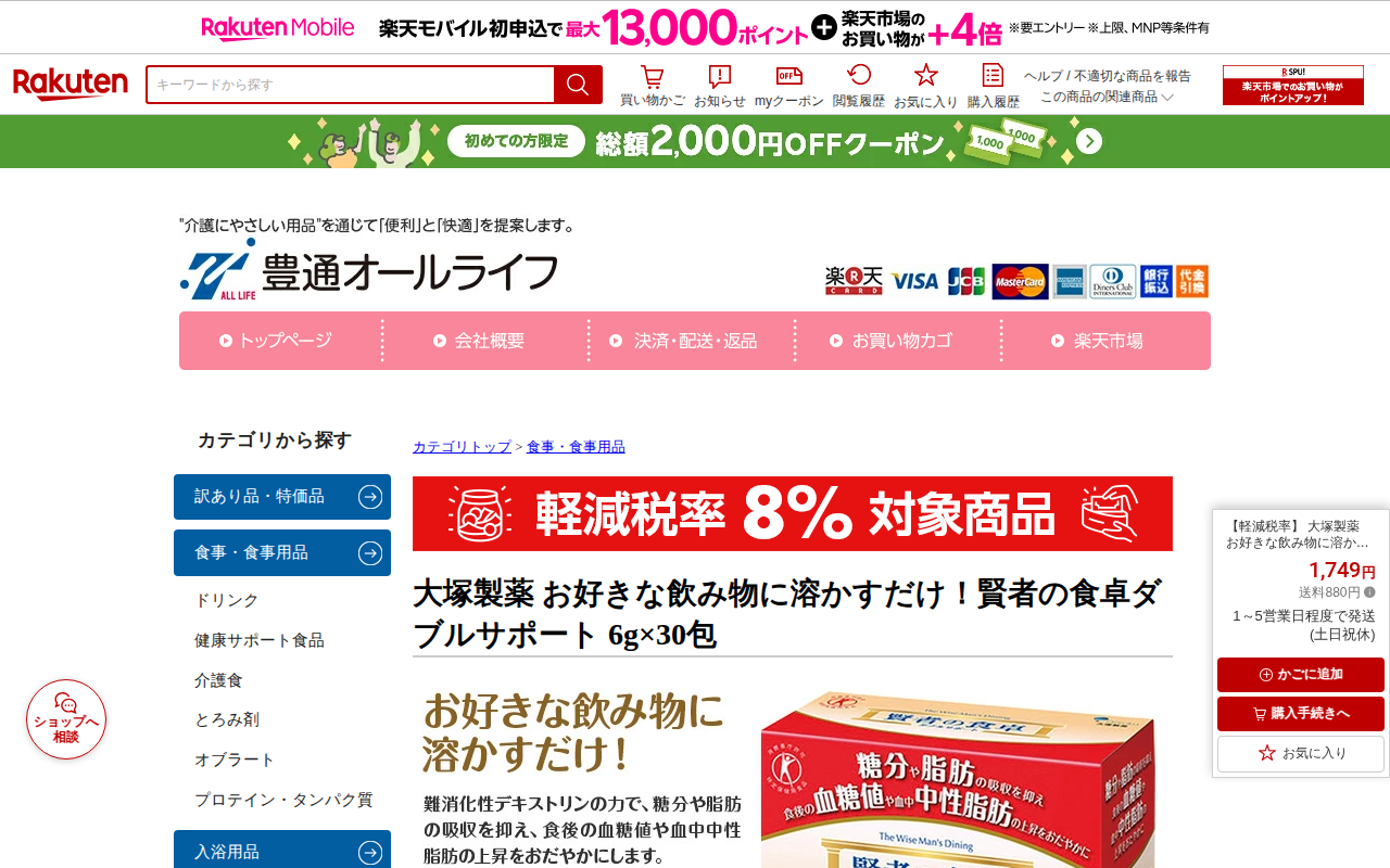 このページは、楽天市場で販売されている大塚製薬の「賢者の食卓」という特定保健用食品の商品紹介です。難消化性デキストリンを含み、糖分や脂肪の吸収を抑えて食後の血糖値や血中中性脂肪の上昇を緩やかにします。1箱6g×30包で1...