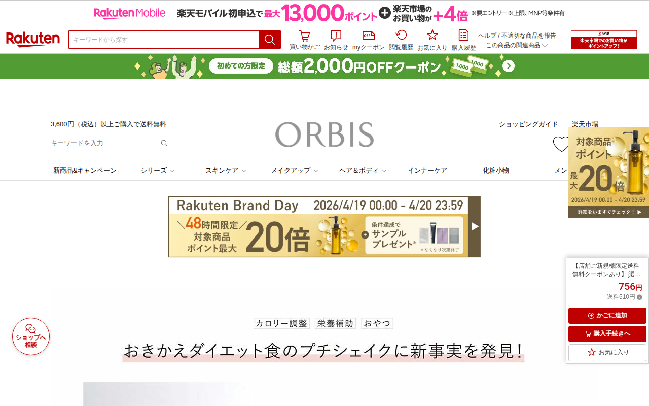 このページはオルビスの公式楽天市場店で販売されているプチシェイク トライアルセットの商品ページです。果実を使用したダイエットサポート飲料で、1食約145~151kcalと低カロリー。ビタミン11種、鉄分、食物繊維を含み、...