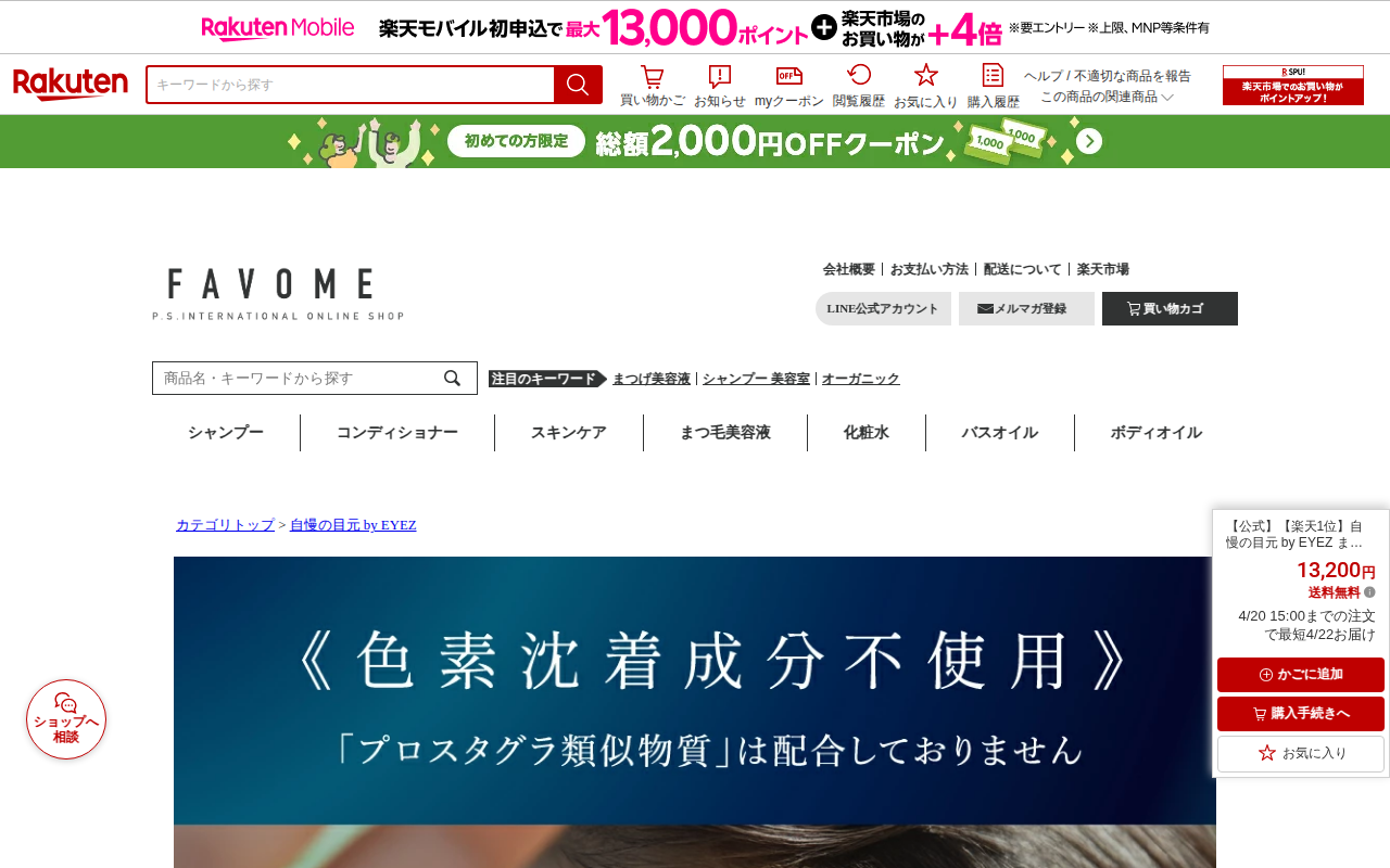 このページは、楽天市場で販売されている「自慢の目元 by EYEZ」のまつ毛美容液の商品ページです。3mlで13,200円、送料無料。約3000兆個の生コラーゲンを配合した2剤式で、フリーズドライ化した生コラーゲンを採用...