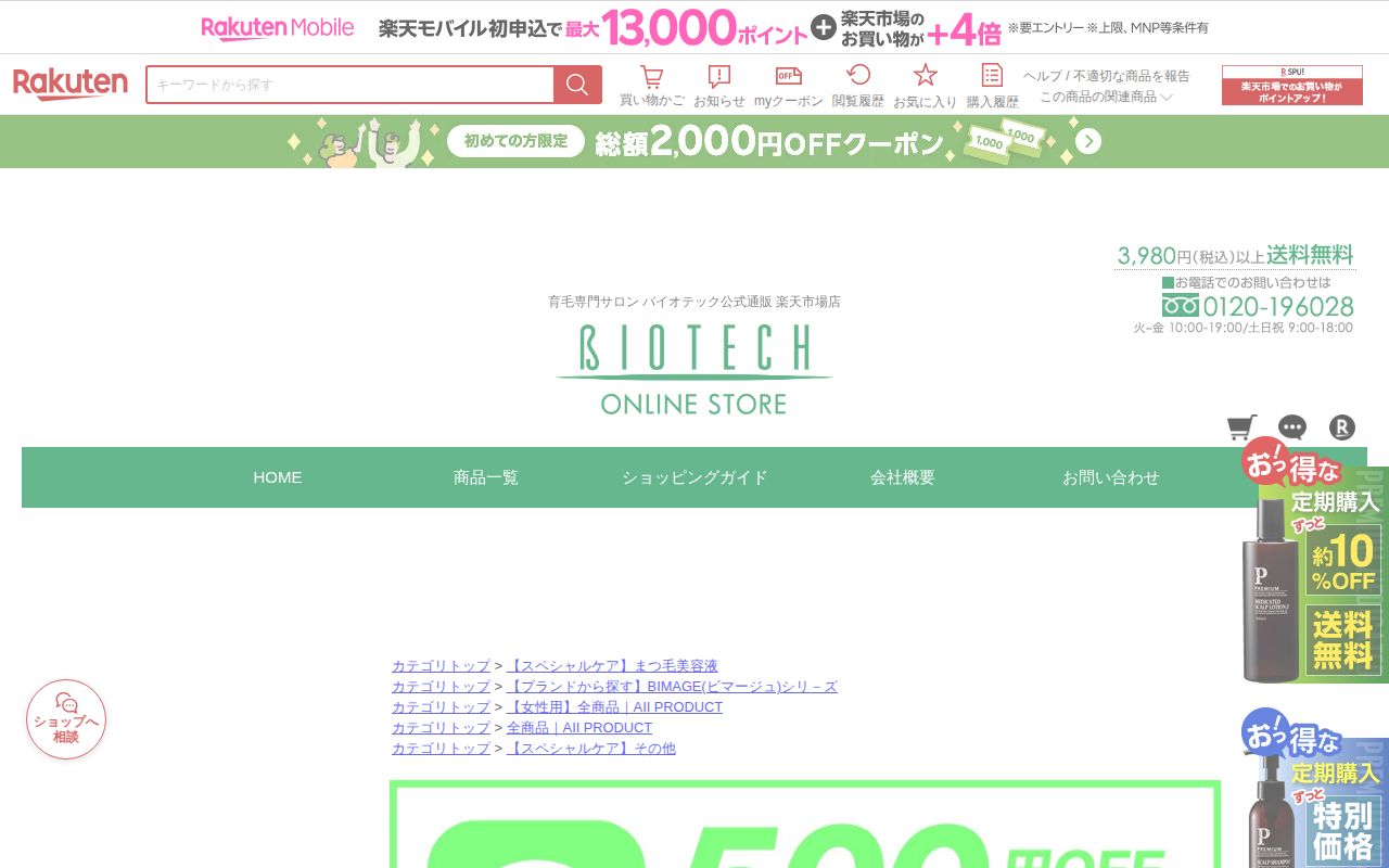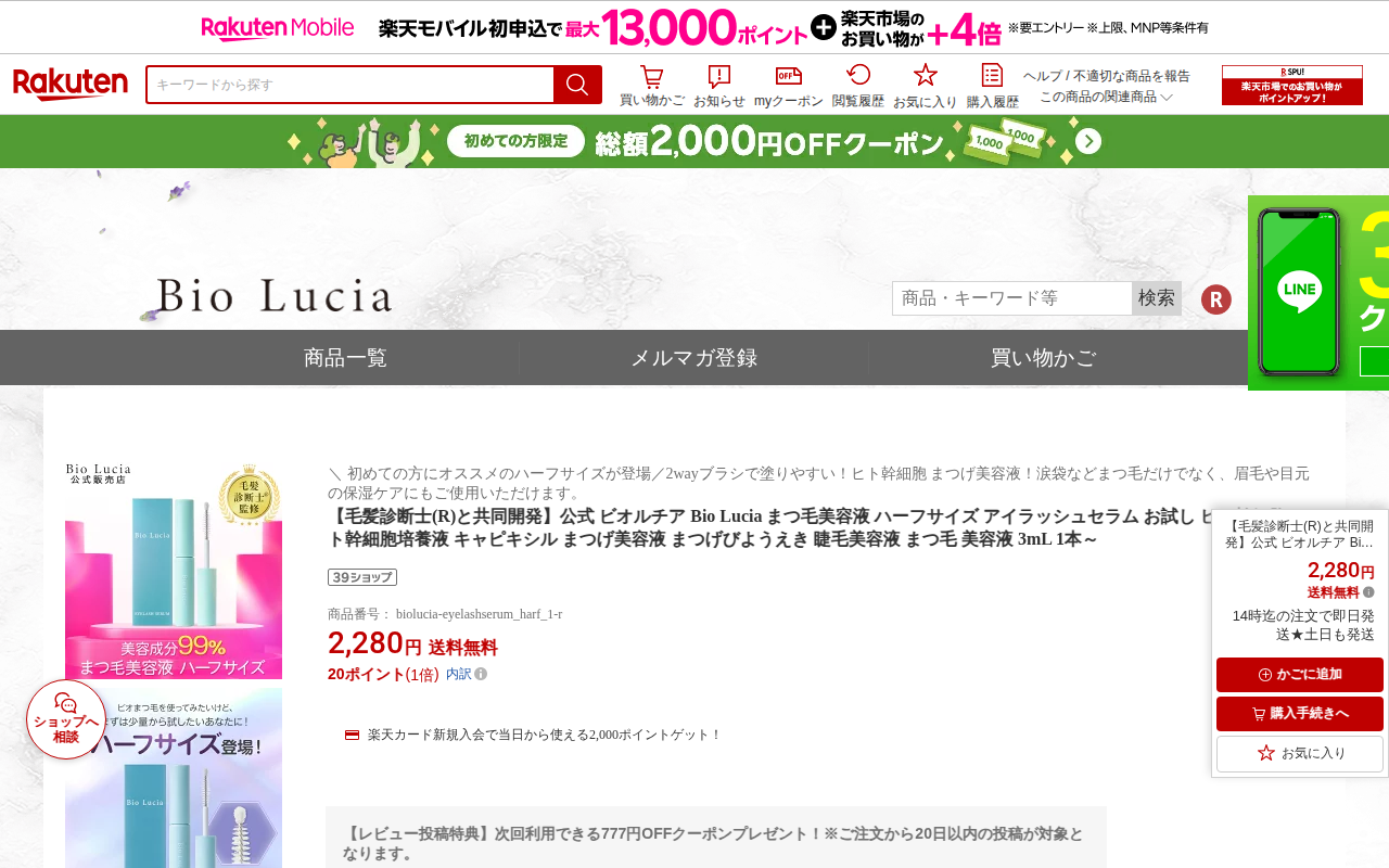 このページは、楽天市場で販売されているビオルチア(Bio Lucia)のまつ毛美容液ハーフサイズ商品の紹介ページです。毛髪診断士と共同開発された3mL入りのアイラッシュセラムで、ヒト幹細胞培養液やキャピキシルを配合してい...