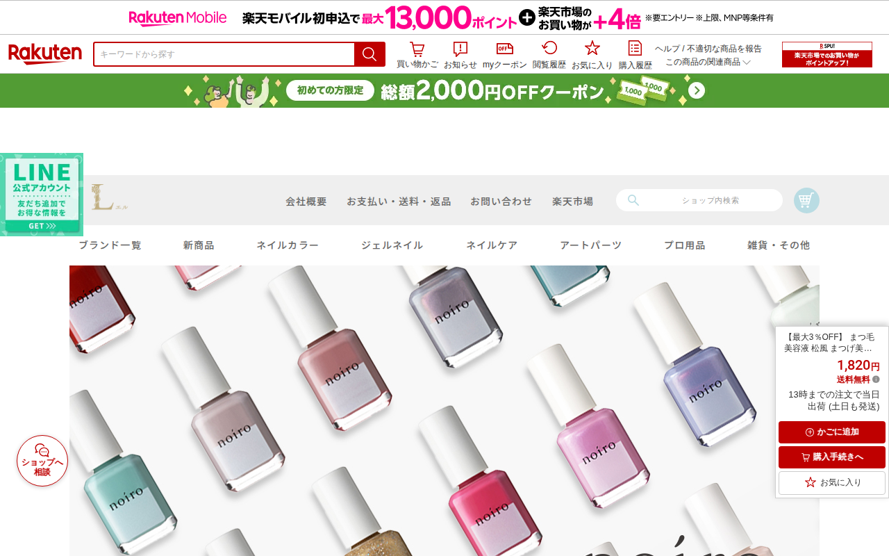 このページは、楽天市場で販売されている松風のまつげ美容液「アイラッシュエッセンス」の商品ページです。価格は1,820円で送料無料。日本製のクリアタイプまつげ専用美容液で、キャピキシル、ヒアルロン酸、コラーゲン、シルク、ア...
