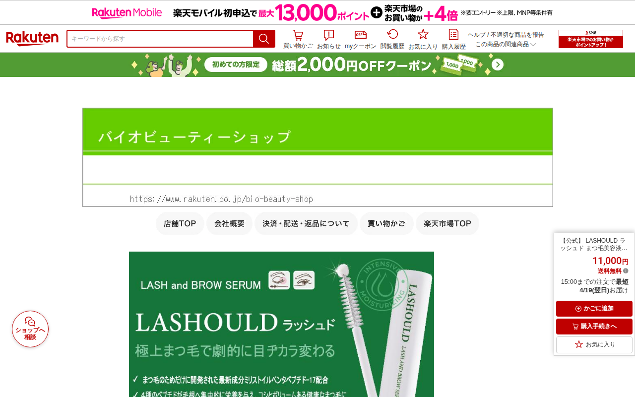 このページはLASHOULD(ラッシュド)のまつ毛美容液の商品ページです。内容量7mlで11,000円、送料無料で販売されています。マツエクやまつ毛パーマ使用中でも使用でき、低刺激で目にしみない製品です。ヒアルロン酸やペ...