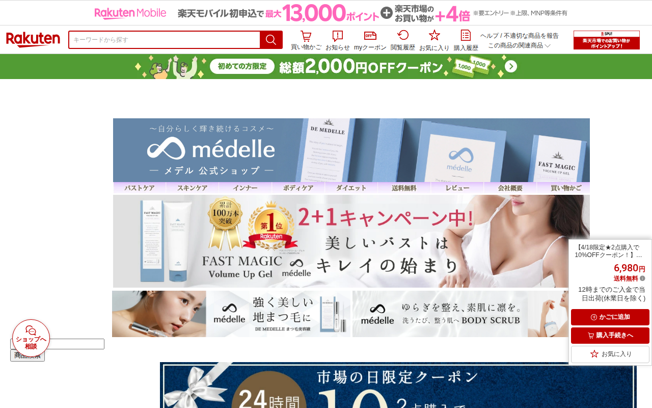 このページは、楽天市場で販売されているメデル デ メデルのまつ毛・まゆ毛用美容液の商品ページです。8ml入りの筆タイプで、価格は6,980円(送料無料)。ヒト幹細胞培養液やフラーレンなどを配合した低刺激処方です。4月18...