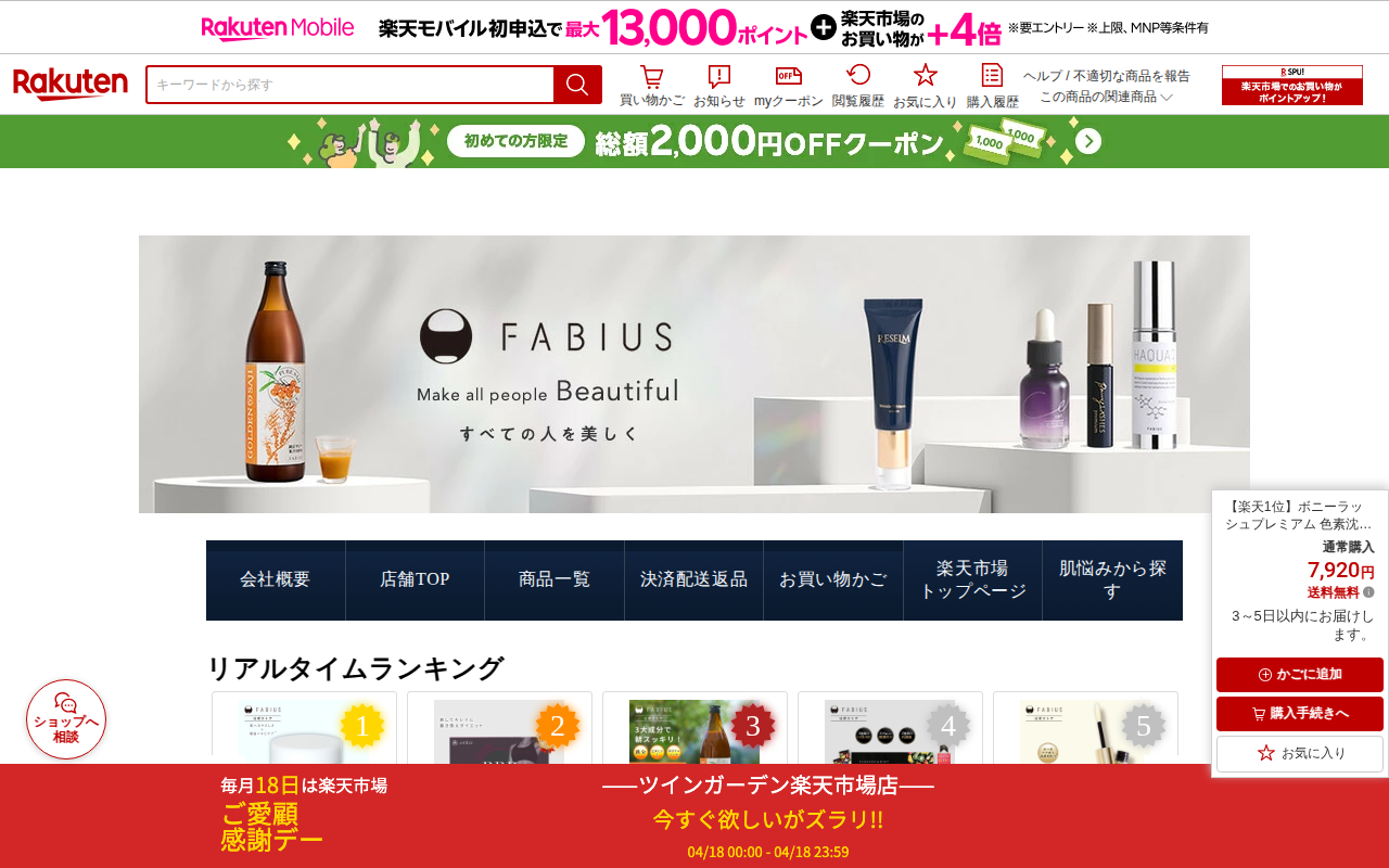このページは、楽天市場で販売されている「ボニーラッシュプレミアム」というまつ毛美容液の商品ページです。ファビウス公式の正規販売店「ツインガーデン楽天市場店」による販売で、価格は7,920円(送料無料)。色素沈着成分不使用...