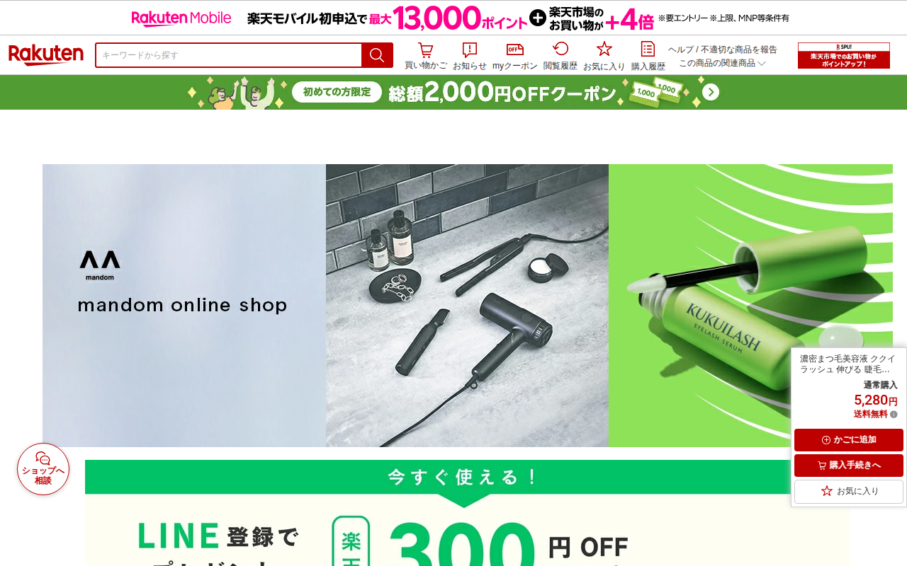 このページはマンダム公式ショップで販売されている「ククイラッシュ」というまつ毛美容液の商品ページです。5mlの日本製製品で、通常価格5,280円、定期購入なら初回2,745円から購入可能です。ビタミンC誘導体とビタミンE...
