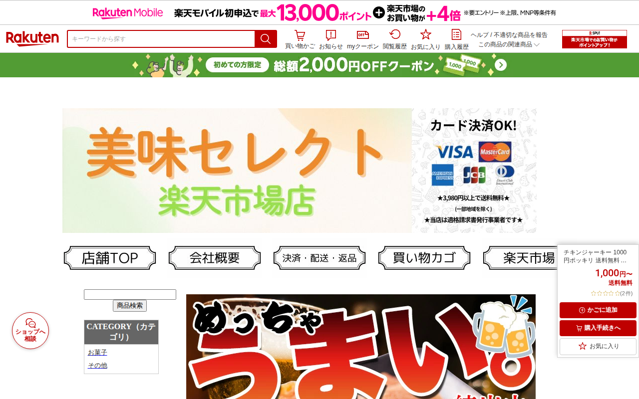 このページは、楽天市場で販売されている国産チキンジャーキーの商品ページです。115g入り1000円で送料無料の訳あり商品で、高たんぱく質(100g当たり50.8g)、低脂肪設計のダイエット食品です。国産鶏むね肉を使用し、...