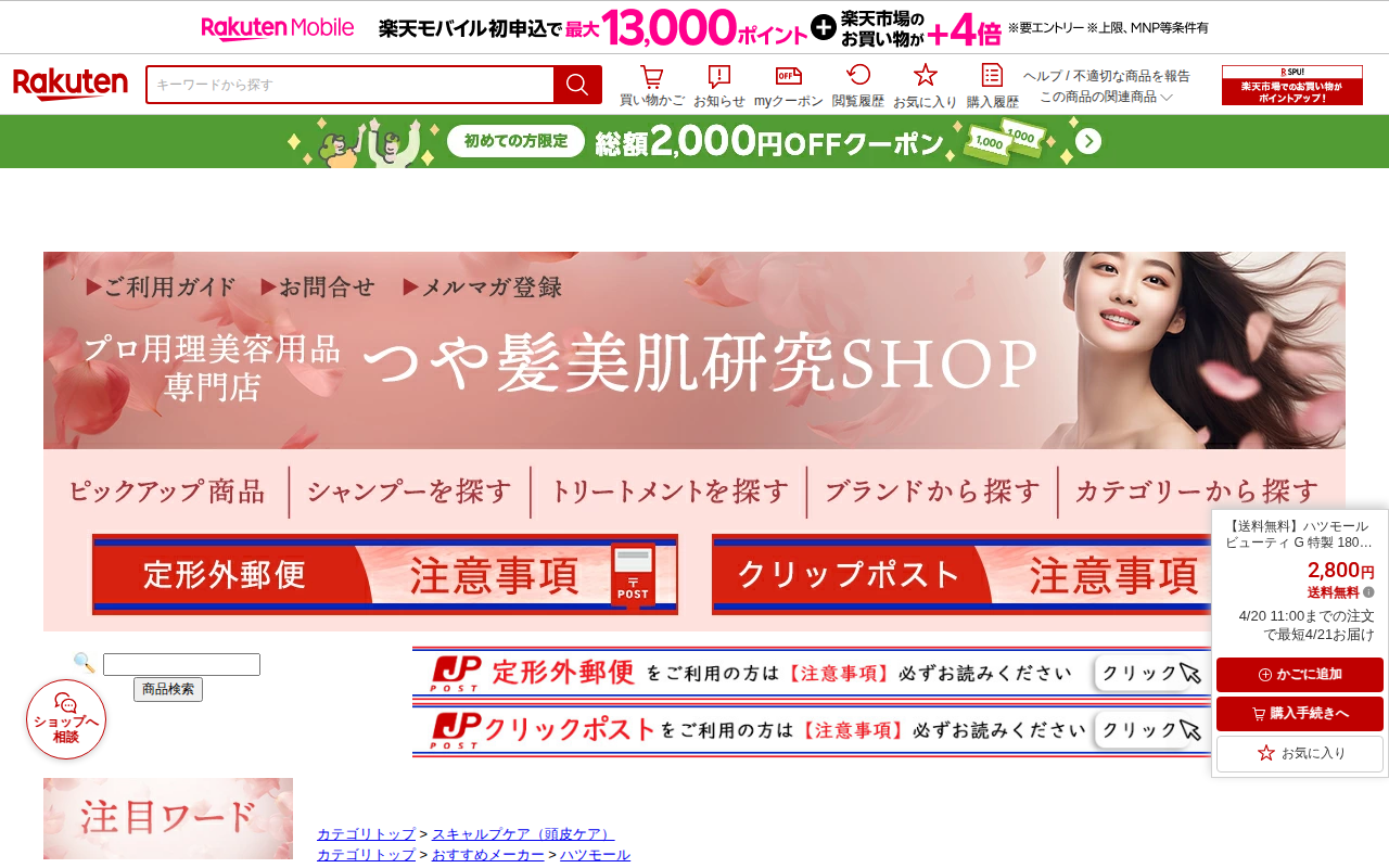 このページは、楽天市場で販売されているハツモール ビューティ G 特製 180mlの商品紹介ページです。2,800円(送料無料)の育毛・養毛剤で、脱毛予防や頭皮ケアに対応するメンズコスメです。頭皮の血行促進により毛根に栄...
