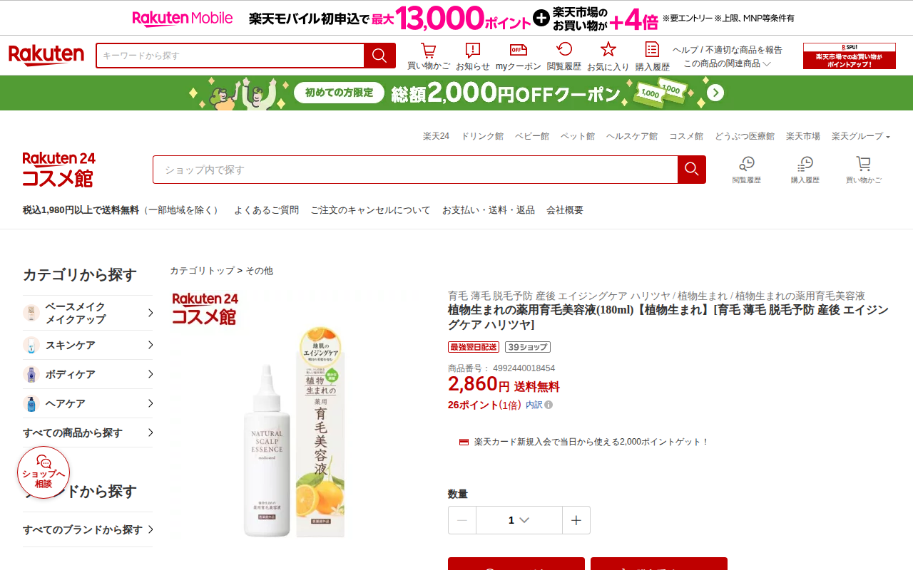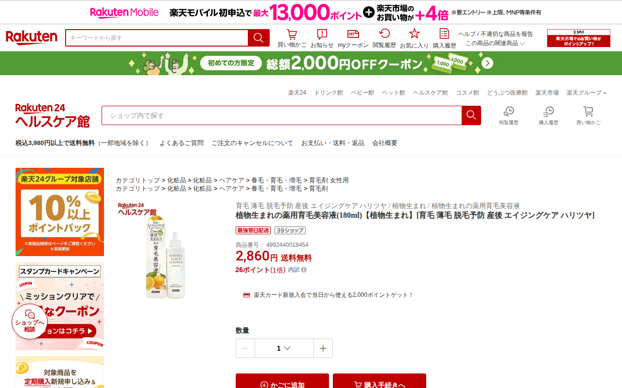 このページは、楽天市場で販売されている「植物生まれの薬用育毛美容液」の商品紹介ページです。価格は2,860円(送料660円)で、100%植物生まれの有効成分を配合した女性向けの育毛美容液です。ニンジンエキス、センブリエキ...