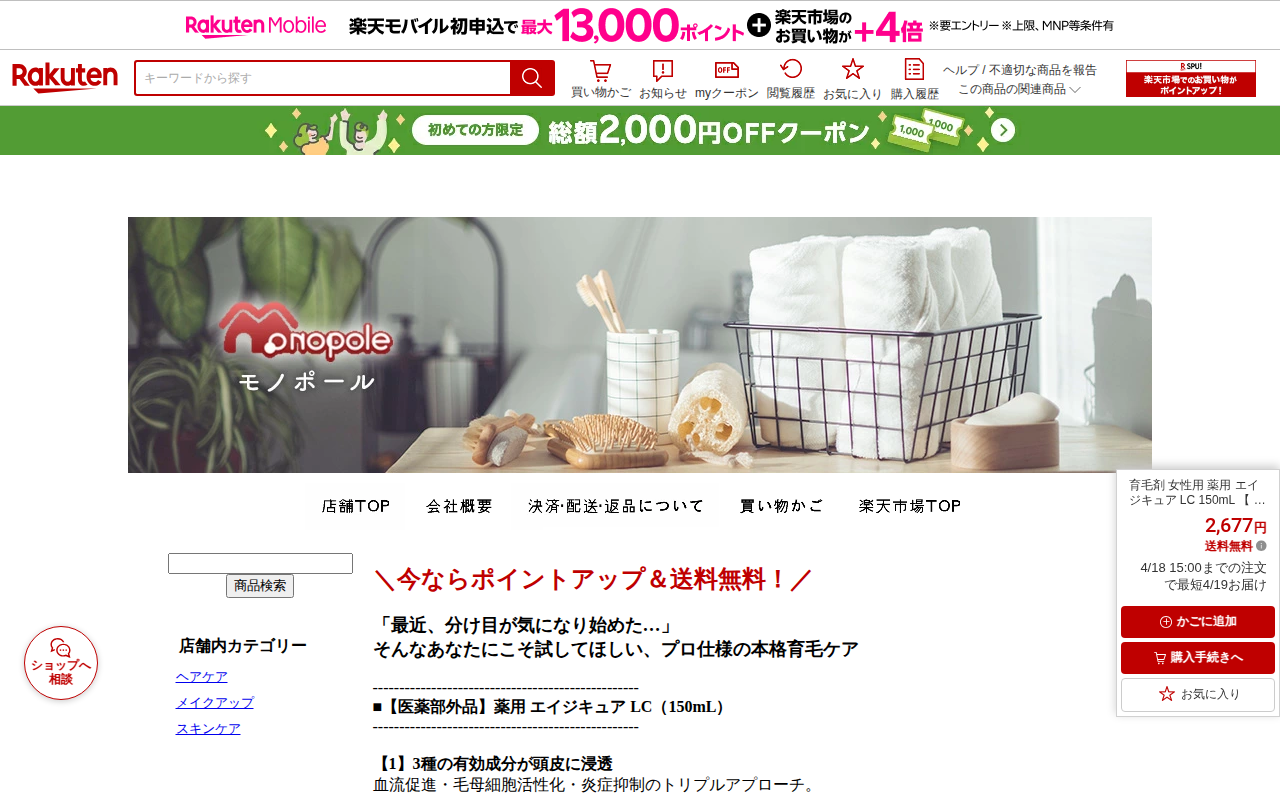 このページは、楽天市場で販売されている女性用薬用育毛剤「エイジキュア LC」(150mL)の商品紹介ページです。医薬部外品で、サロン専売品です。セファランチン、パントテニルエチルエーテル、グリチルリチン酸2Kの3つの有効...