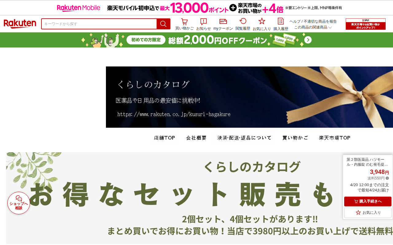 このページは、楽天市場で販売されている第2類医薬品「ハツモール・内服錠」の商品ページです。男女兼用の飲む発毛促進剤で、180錠入り3,948円(送料550円)。粃糠性脱毛症と円形脱毛症に効能があります。成人は1日6錠を2...