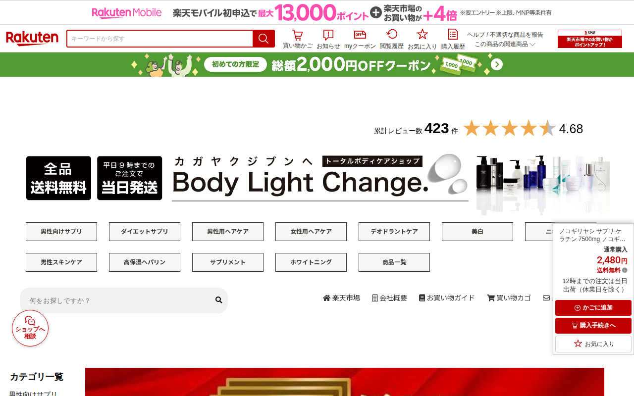 このページは、楽天市場で販売されているRERESTAブランドの女性向けサプリメント「Black Up Energy For Ladies」の商品ページです。ケラチン7500mg、ノコギリヤシ2250mgを含み、亜鉛、大豆...