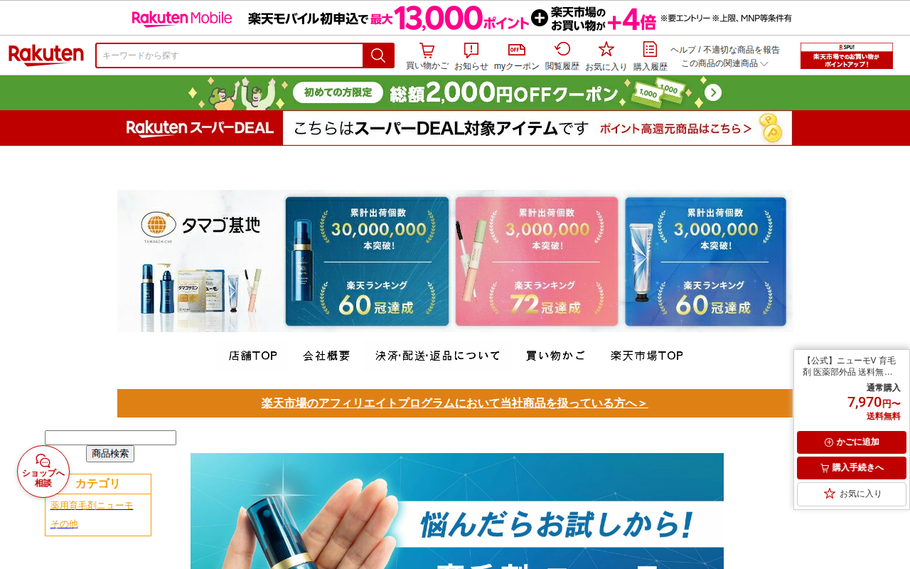 このページは、楽天市場で販売されている「ニューモV」という育毛剤の商品ページです。医薬部外品で、通常購入は7,970円から、定期購入なら最大20%割引で購入できます。センブリエキスやグリチルリチン酸などの有効成分を含み、...