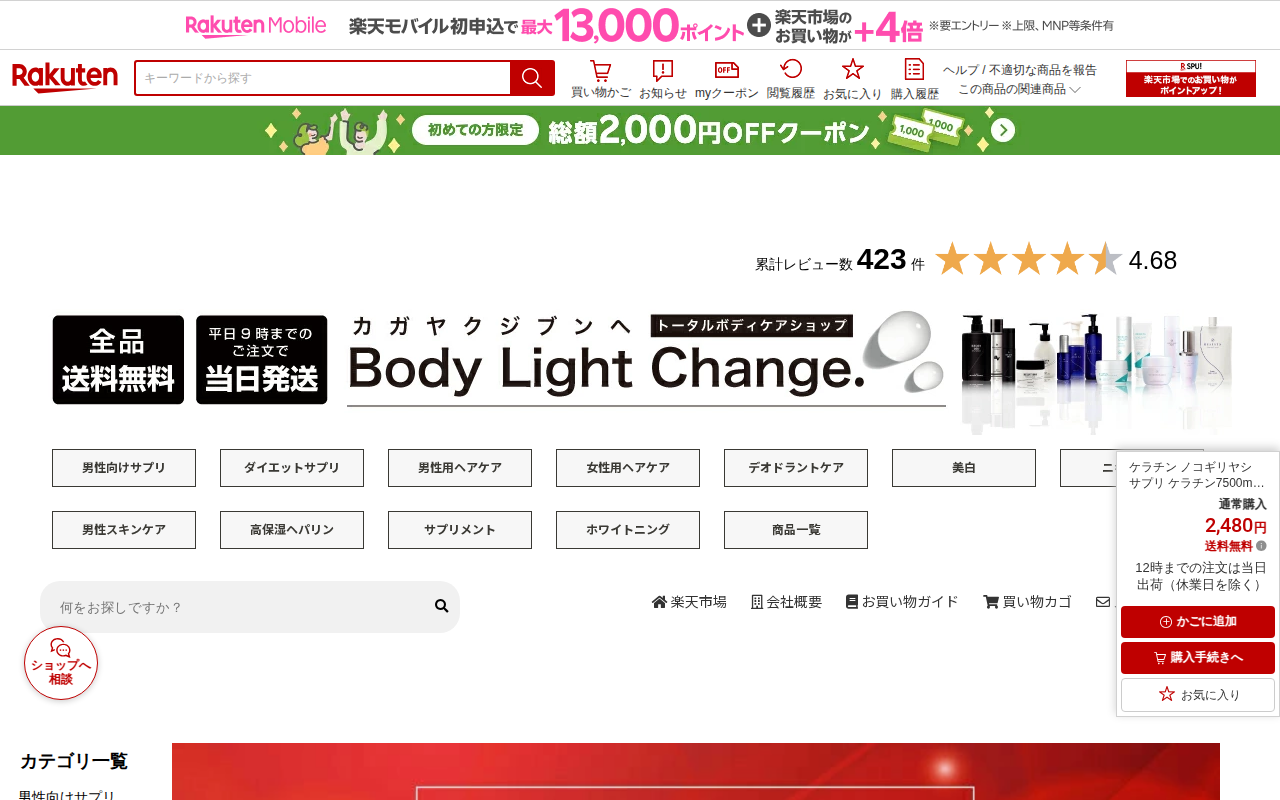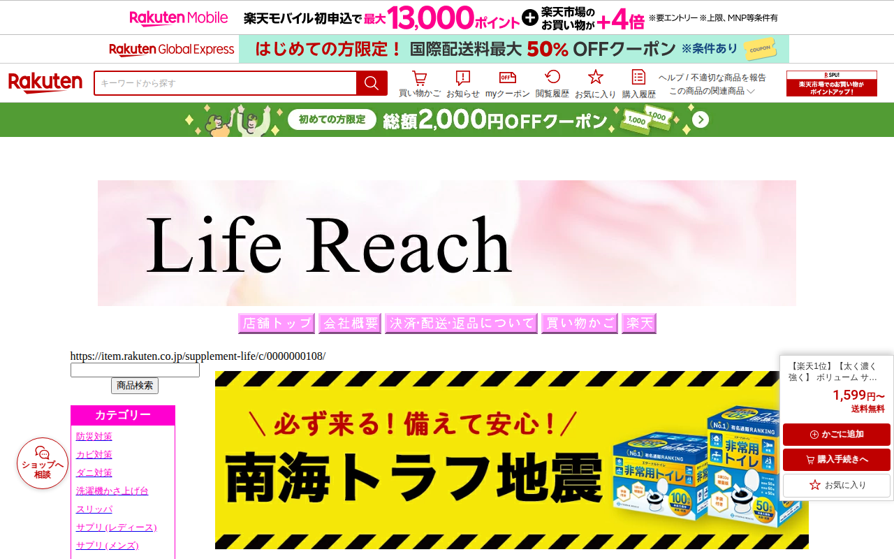 このページは、楽天市場で販売されているメンズ向けボリュームサプリメントの商品紹介ページです。ケラチン、ノコギリヤシ、亜鉛など10種類の成分を配合した60粒30日分のサプリメントで、価格は1袋1,599円から3袋セット3,...