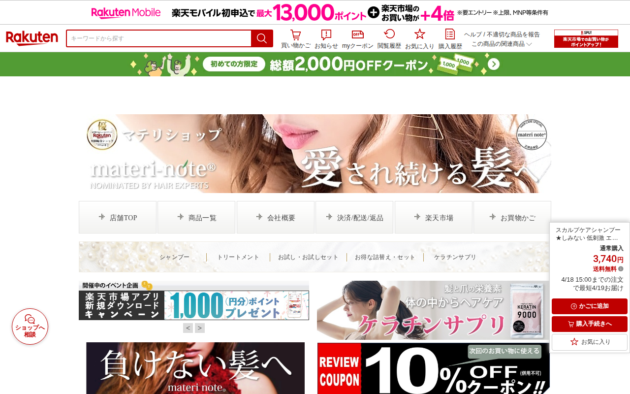 このページは、楽天市場で販売されているエイジングケア専門のスカルプシャンプー「プライムシャンプー」の商品紹介ページです。価格は3,740円で送料無料。植物性アミノ酸系洗浄成分、キャピキシル、植物幹細胞エキス、ナールスゲン...