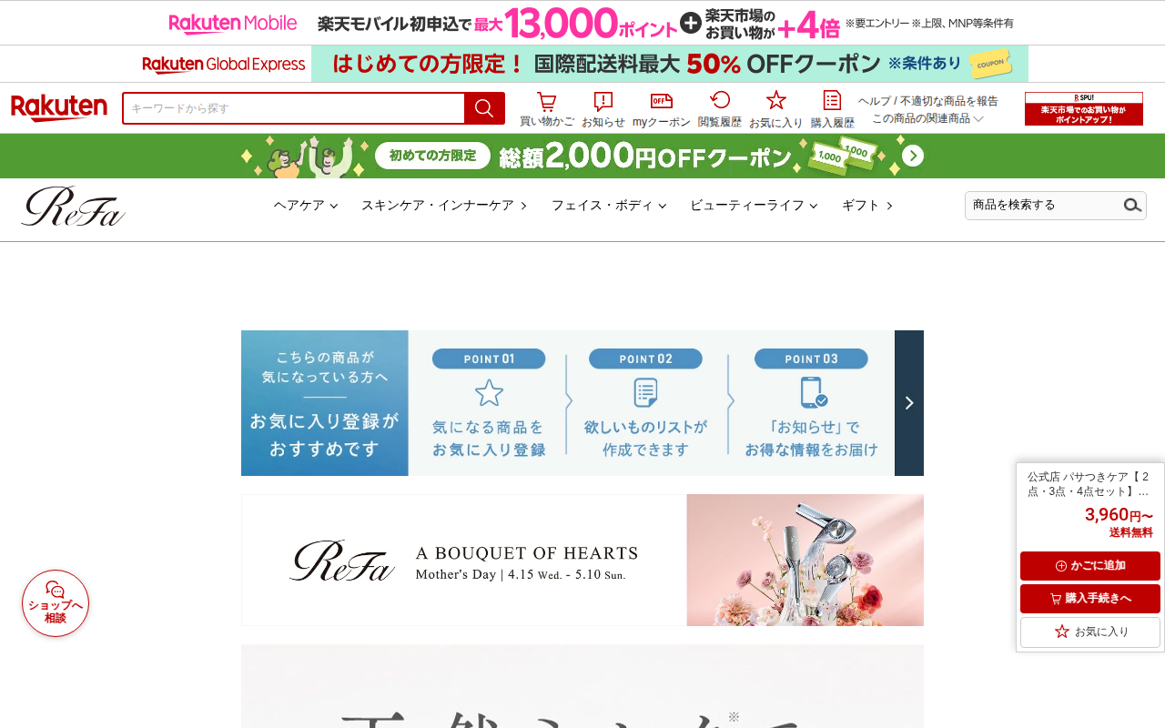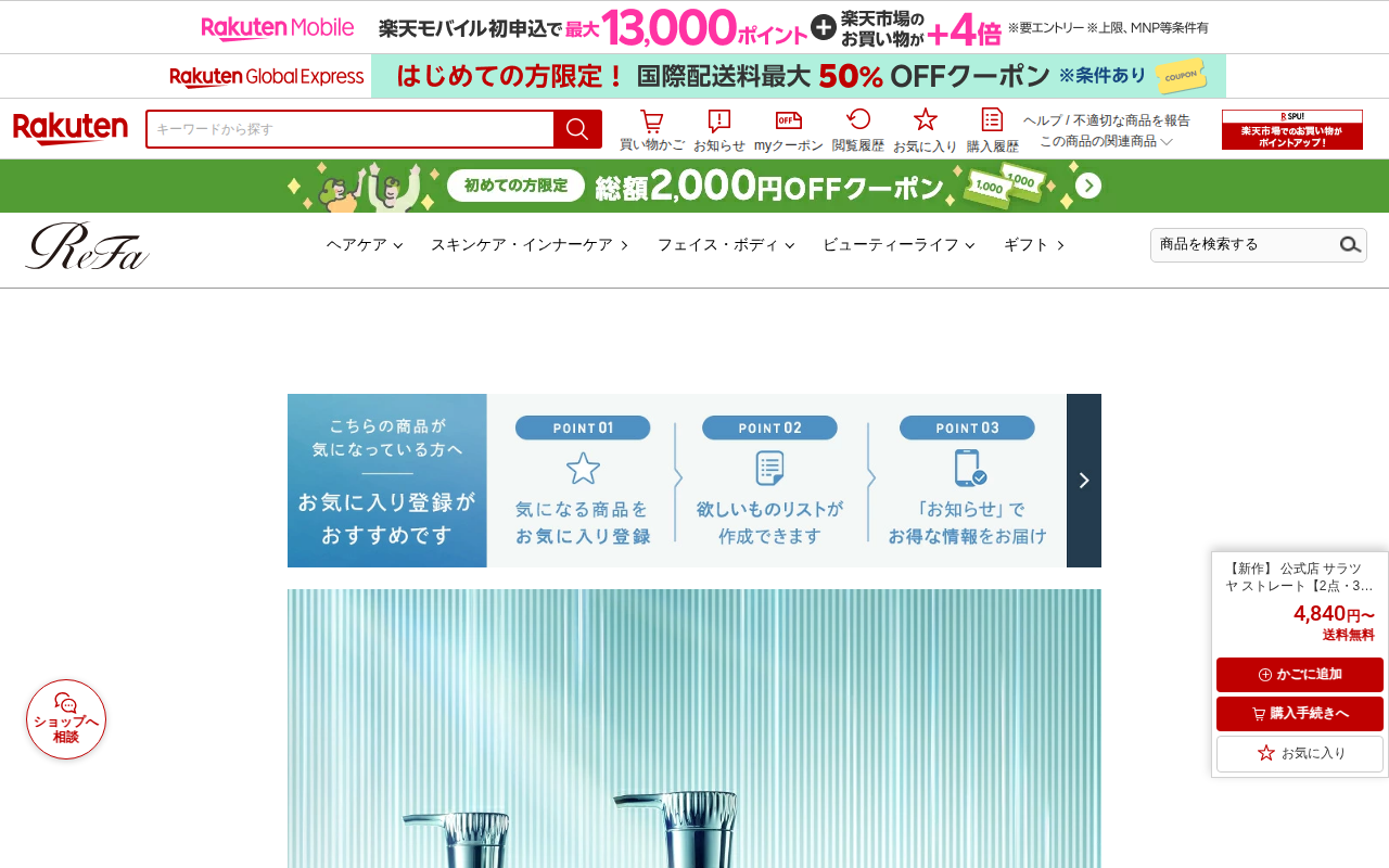このページはMTGの公式店で販売されるReFaのミルクプロテインストレートシャンプーとトリートメントのセット商品を紹介しています。2点または3点セットで4,840円からの価格で、送料無料です。うねりやまとまりを改善するヘ...