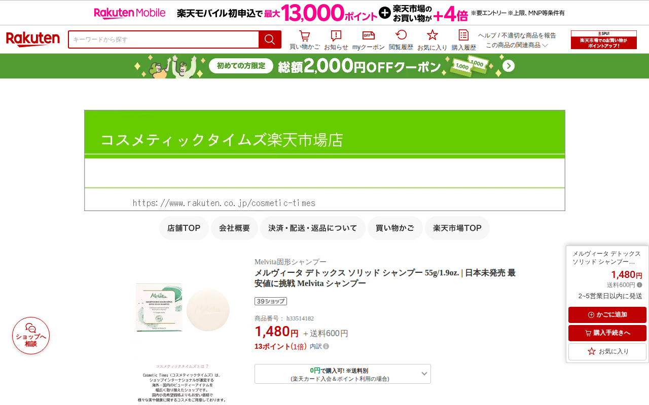 このページはメルヴィータのデトックス ソリッド シャンプー55gを販売する楽天市場の商品ページです。価格は1,480円で、送料は600円(3,980円以上で送料無料)。フランス製の油性髪用固形シャンプーで、頭皮の皮脂バラ...