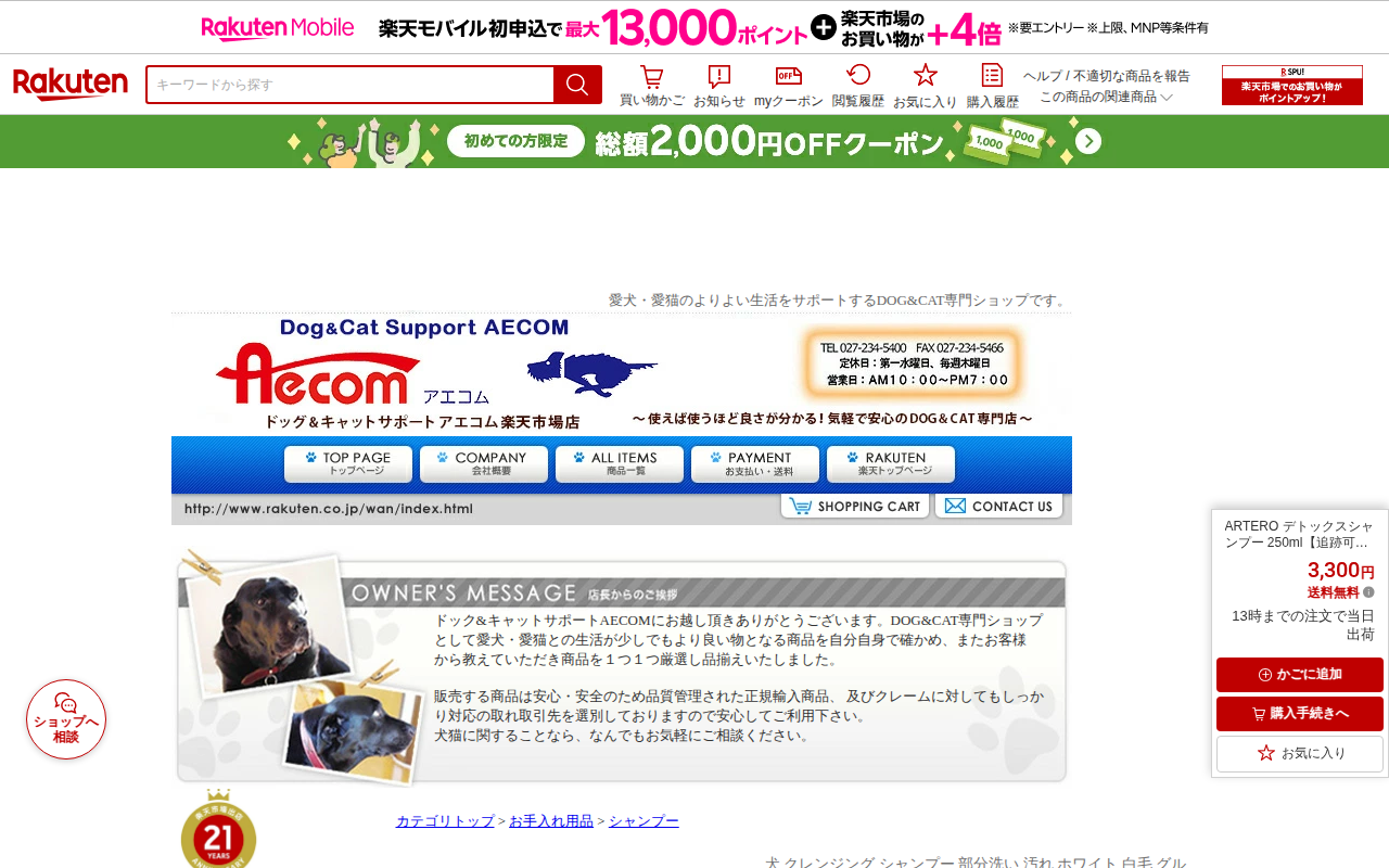 このページは、楽天市場で販売されているARTERO デトックスシャンプー250mlの商品ページです。木炭パウダー配合で、体臭が強い犬や汚れが多い犬、ホワイトカラーの犬の足の汚れなどをしっかり落とせるクレンジングシャンプー...