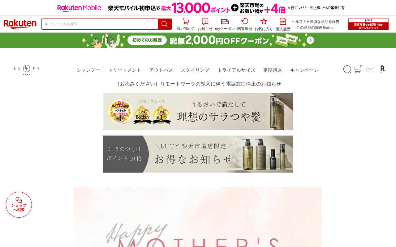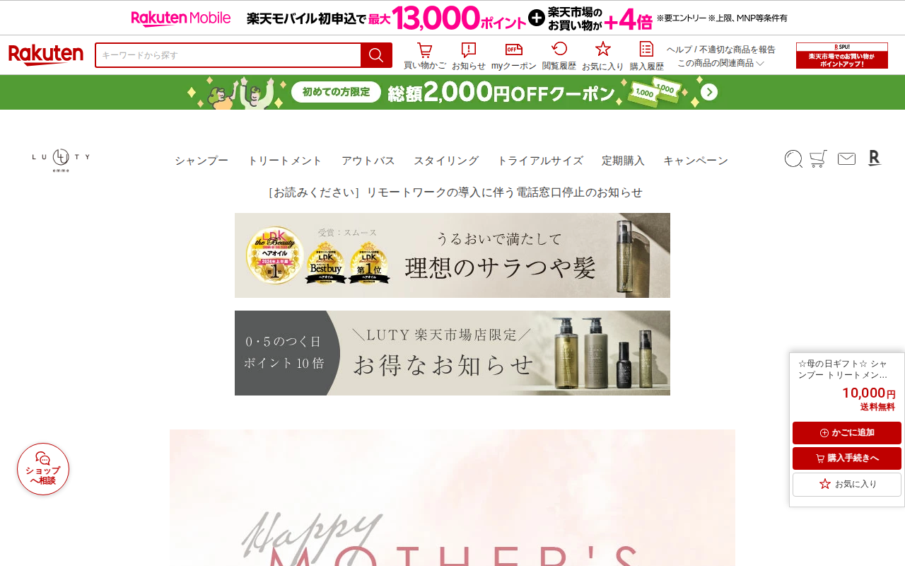このページは、楽天市場で販売されているLUTY(ルーティー)のヘアケア商品「コンプリートセット」の商品ページです。シャンプー、トリートメント、ヘアオイル、ヘアミルクの4点セットで、価格は10,000円(送料無料)。楽天ラ...