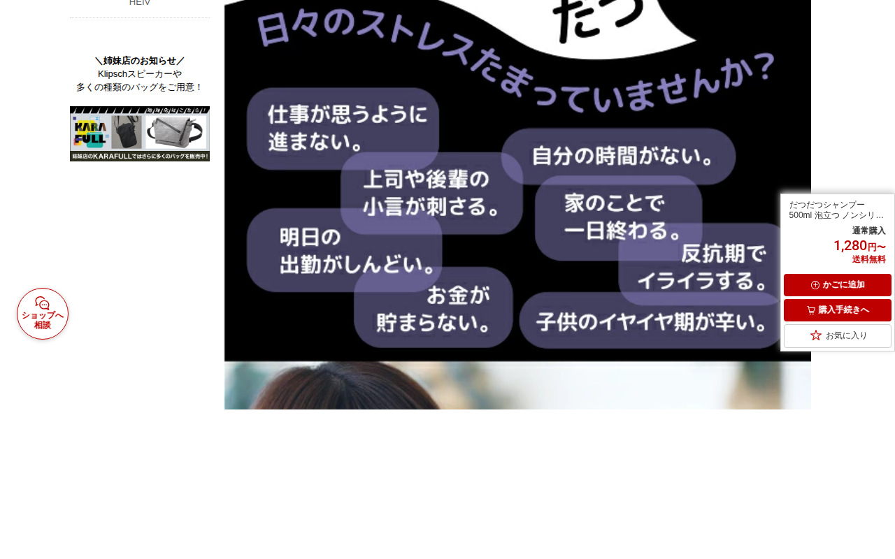 このページは、楽天市場で販売されている「だつだつシャンプー」の商品ページです。500ml入りで、ノンシリコンながら泡立ちが良く、添加物不使用が特徴です。ストレスで疲れた人のために開発された機能性シャンプーで、3万本以上の...
