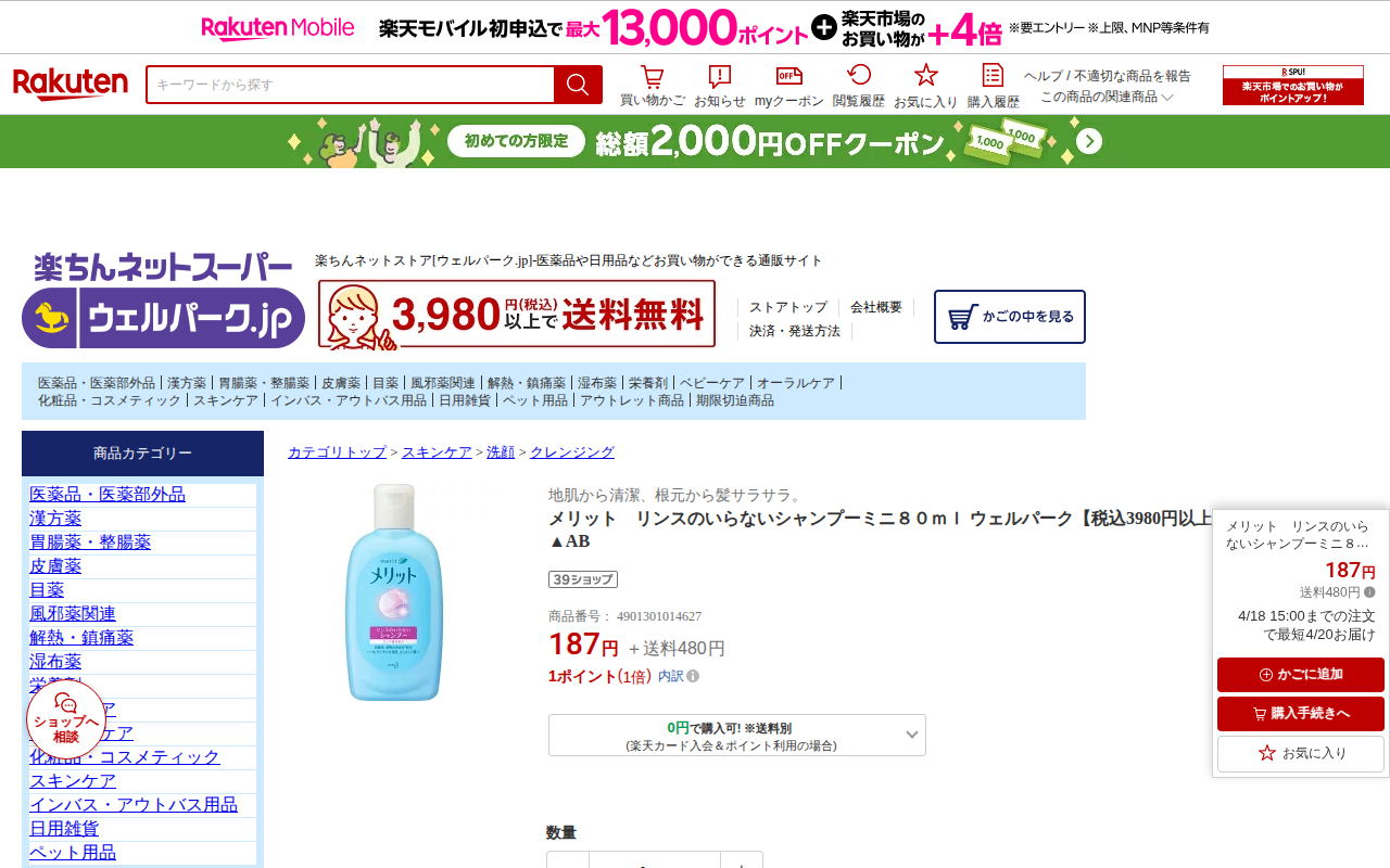 このページは、楽天市場のウェルパーク店で販売されているメリットのリンスのいらないシャンプーミニ80mlの商品ページです。価格は187円で、送料は480円(税込3980円以上で送料無料)。弱酸性で植物由来成分配合、リンス成...