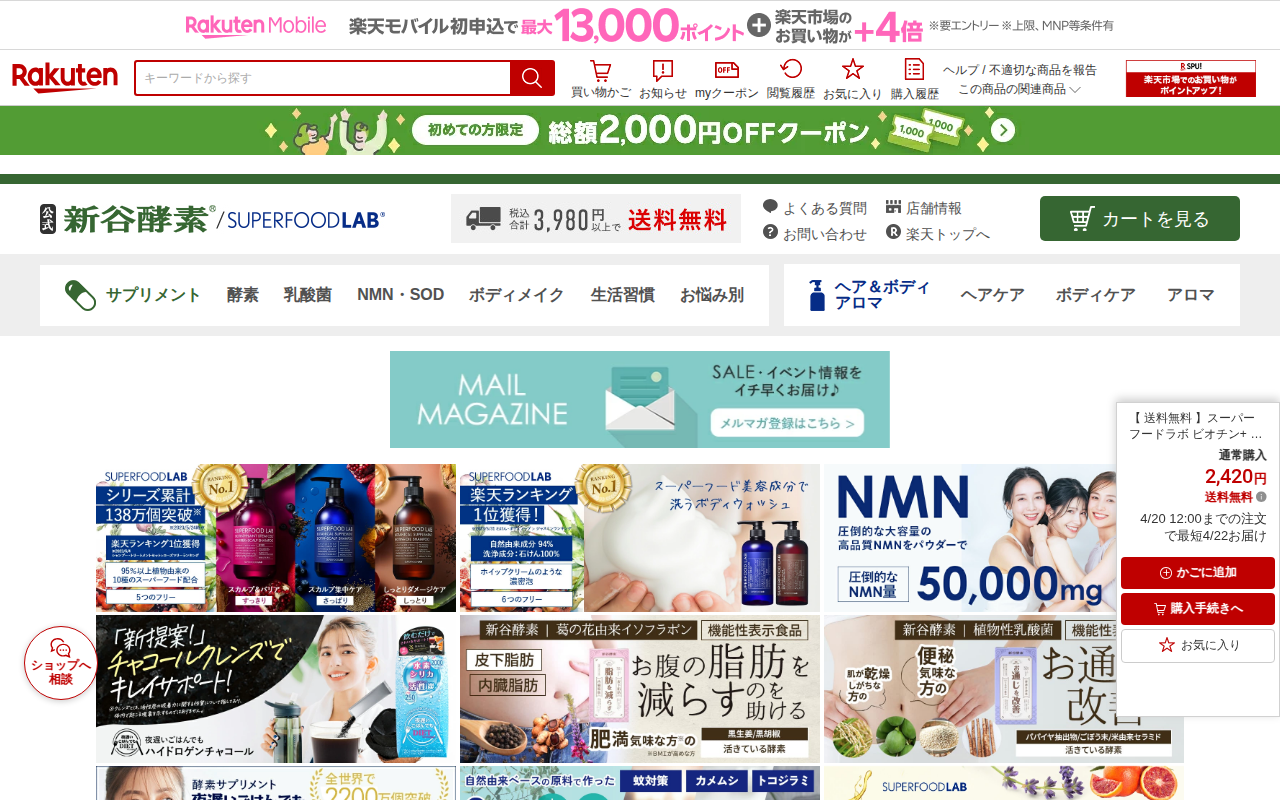 このページは、楽天市場で販売されているスーパーフードラボのビオチン+スカルプシャンプー詰め替え400mlとトリートメント詰め替え400gのセット商品の紹介ページです。通常購入時の価格は2,420円で送料無料です。定期購入...