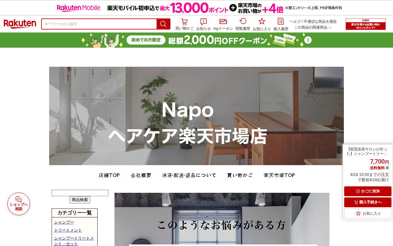 このページは、髪質改善サロンが開発したシャンプートリートメントセット(500ml詰め替え品)の楽天市場での販売ページです。価格は7,700円で送料無料。アミノ酸系の処方でノンシリコン、ケラチン配合、カラーケアとうねり対策...