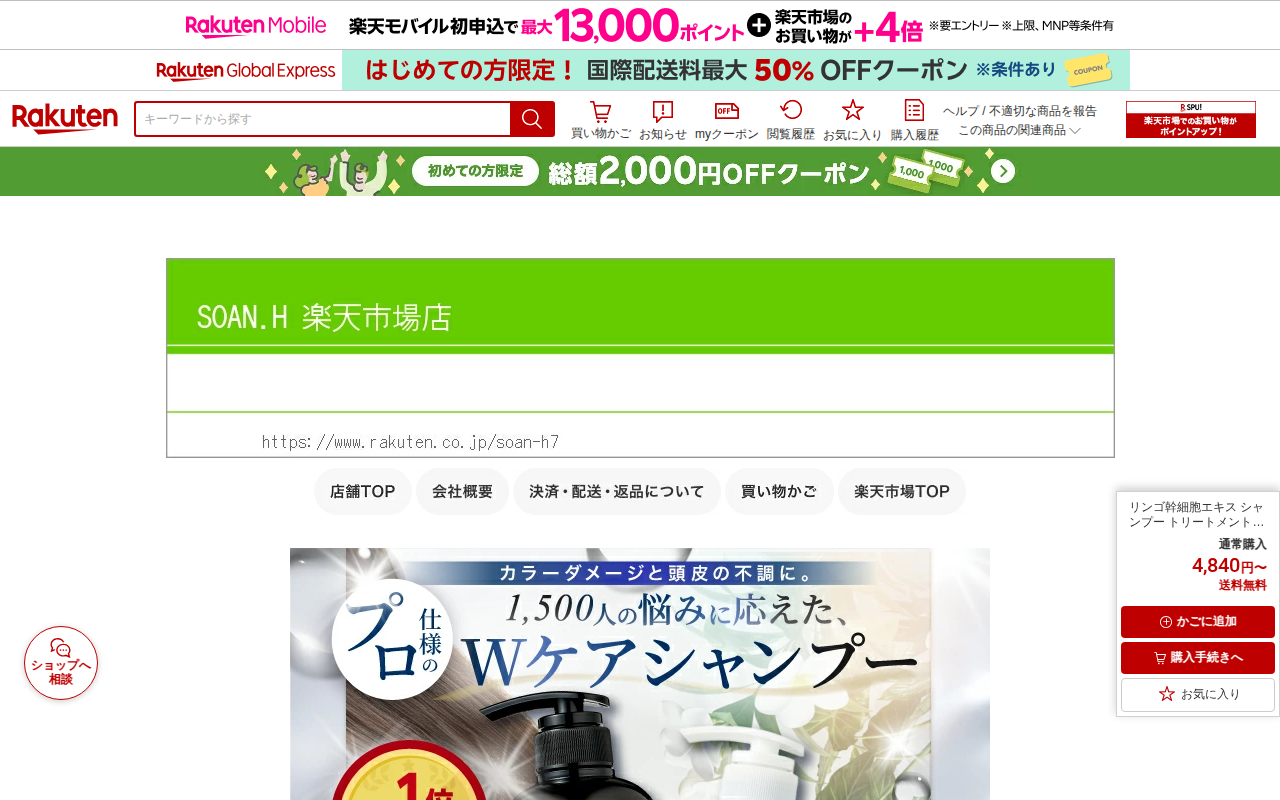 このページは、楽天市場で販売されているリンゴ幹細胞エキス配合のシャンプー・トリートメントセットの商品ページです。現役美容師が開発したスカルプケア製品で、アミノ酸系洗浄成分を使用し、頭皮の汚れやフケ、かゆみ、臭いを防ぎなが...
