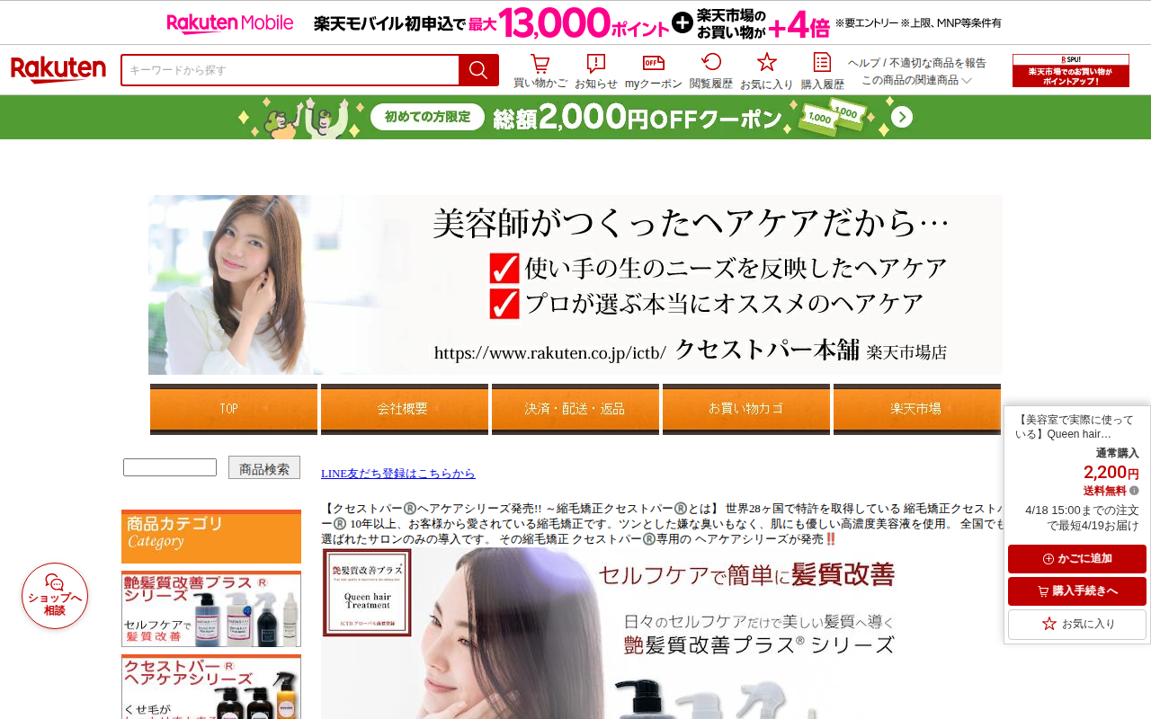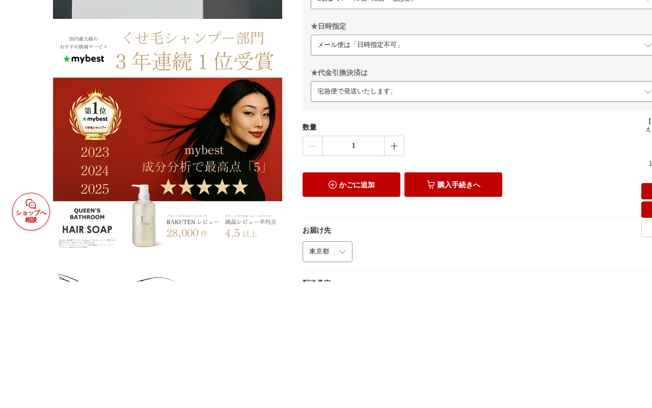 このページはQween's Bathroom(クイーンズバスルーム)の高濃度ケラチンシャンプー・トリートメント トライアルセットを紹介しており、楽天市場で2,200円で販売されています。くせ毛部門で3年連続1位を獲得した...