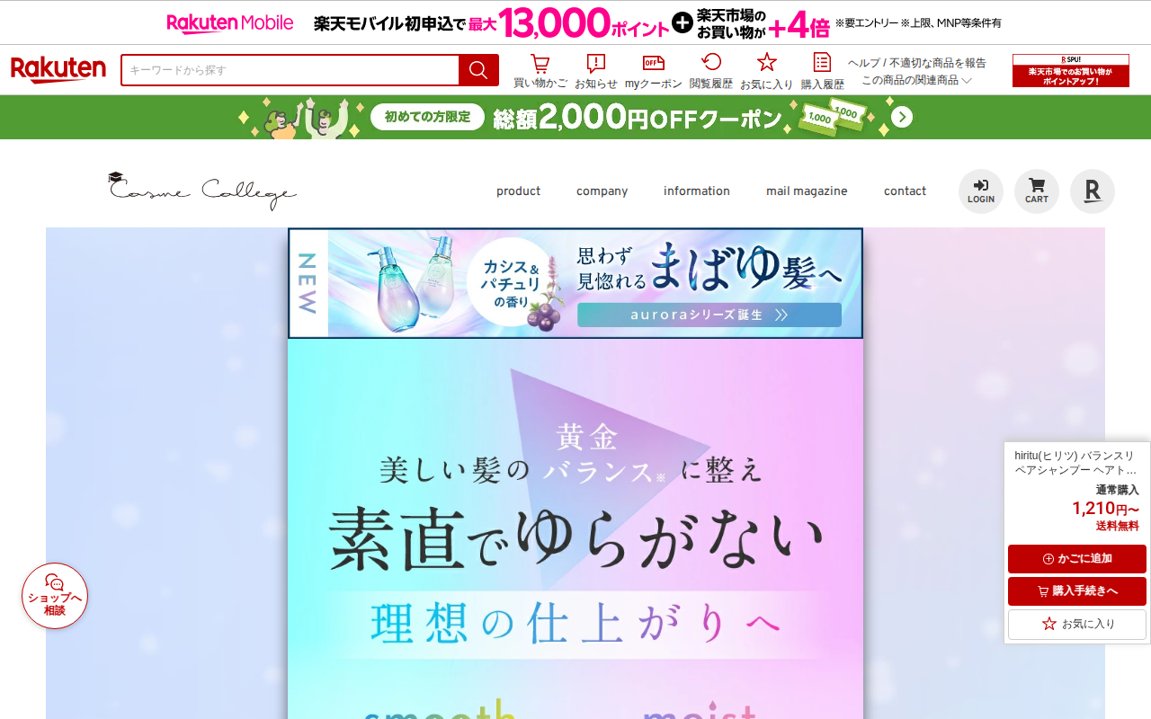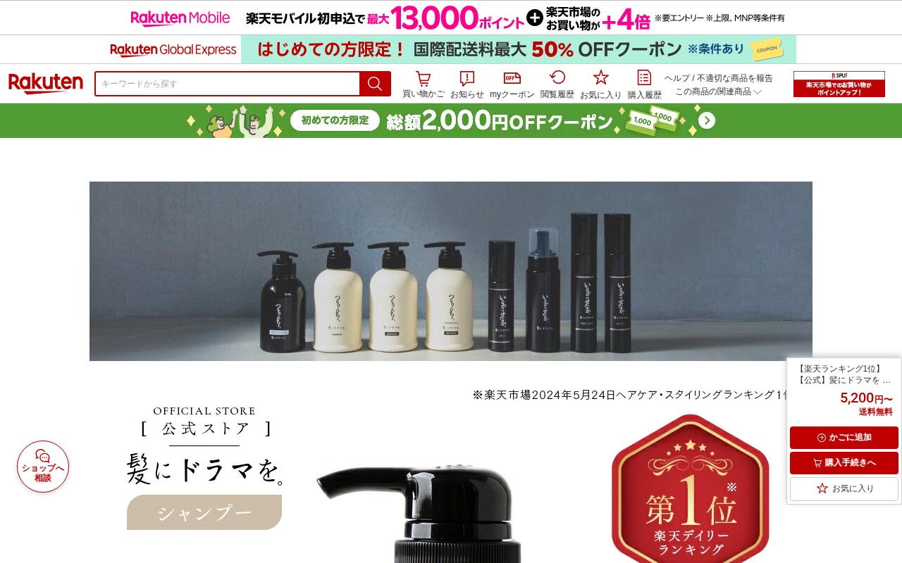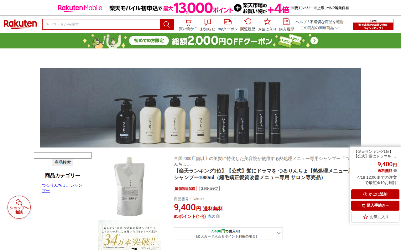 このページは、楽天市場で販売されている「髪にドラマを つるりんちょ」シャンプーの商品ページです。全国2000店舗以上の美容師が使用する、熱処理ダメージに着目したヘアケア製品で、楽天ランキング1位を獲得しています。縮毛矯正...