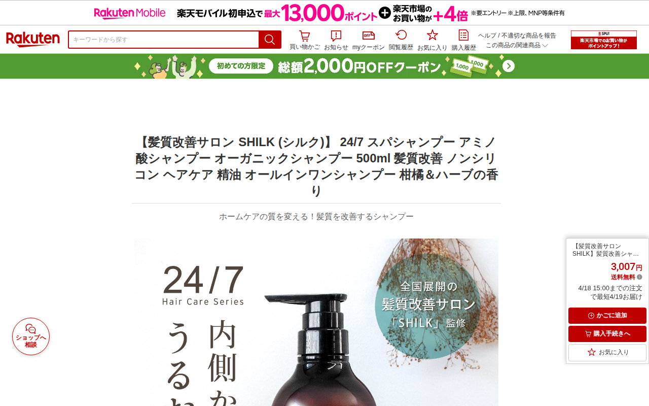 このページは、楽天市場で販売されているSHILKブランドの髪質改善シャンプー「24/7 Spa」の商品紹介ページです。500mL入りで3,007円(送料無料)。オーガニック成分配合のノンシリコン、アミノ酸系シャンプーで、...