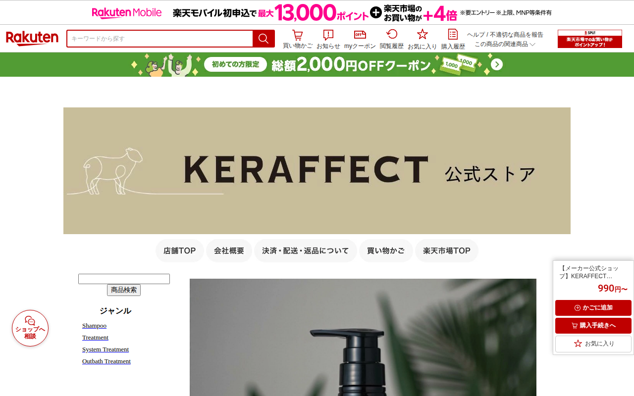 このページはKERAFFECT SMOOTH RESET SHAMPOOの楽天市場での販売ページです。活性ケラチン配合のホームケア用シャンプーで、ダメージ補修と保湿効果があります。メーカー公式ショップによる販売で、お試し...
