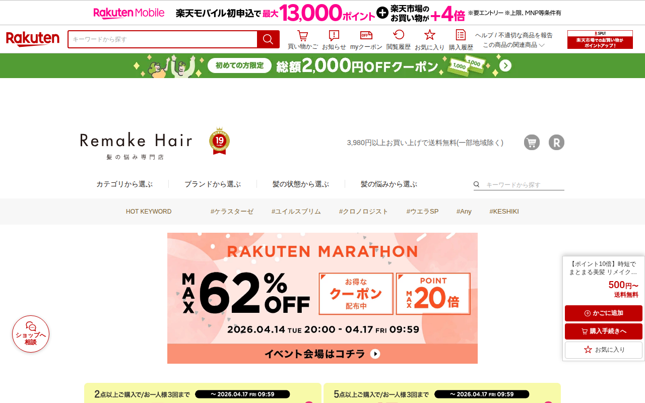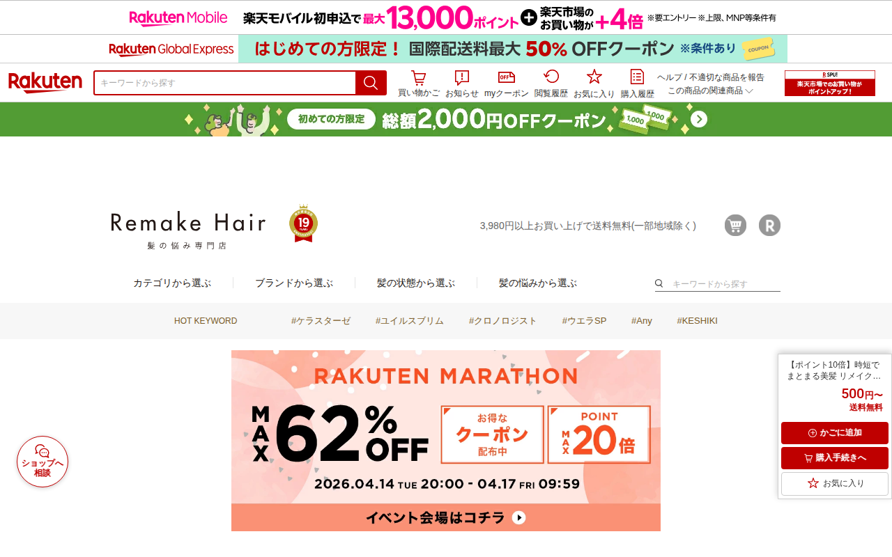 このページは、楽天市場の「リメイクヘアー 髪の悩み専門店」で販売されている「リメイク シャンプー クリア」の商品ページです。髪質再生専門サロン開発のオールインワンシャンプーで、トリートメント不要で時短でまとまる美髪を実現...