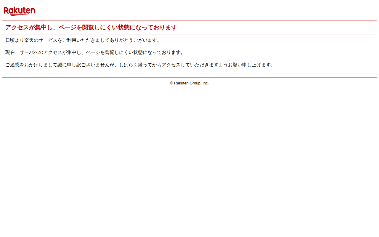 このページは、楽天のサーバーへのアクセスが集中している状況を通知するものです。現在、ページの閲覧がしにくい状態になっており、ユーザーに対して申し訳ないという謝罪と、しばらく時間をおいてからアクセスするよう促しています。...