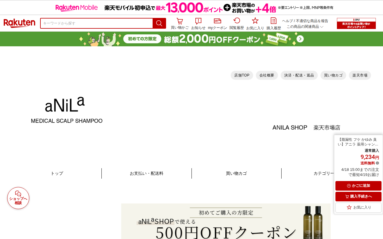 このページは、毛髪診断士が開発した医薬部外品の薬用シャンプー「アニラ」の販売ページです。脂漏性フケ、かゆみ、臭いなどの頭皮トラブルに対応した製品で、240ml×3本セットが9,234円(送料無料)で販売されています。界面...