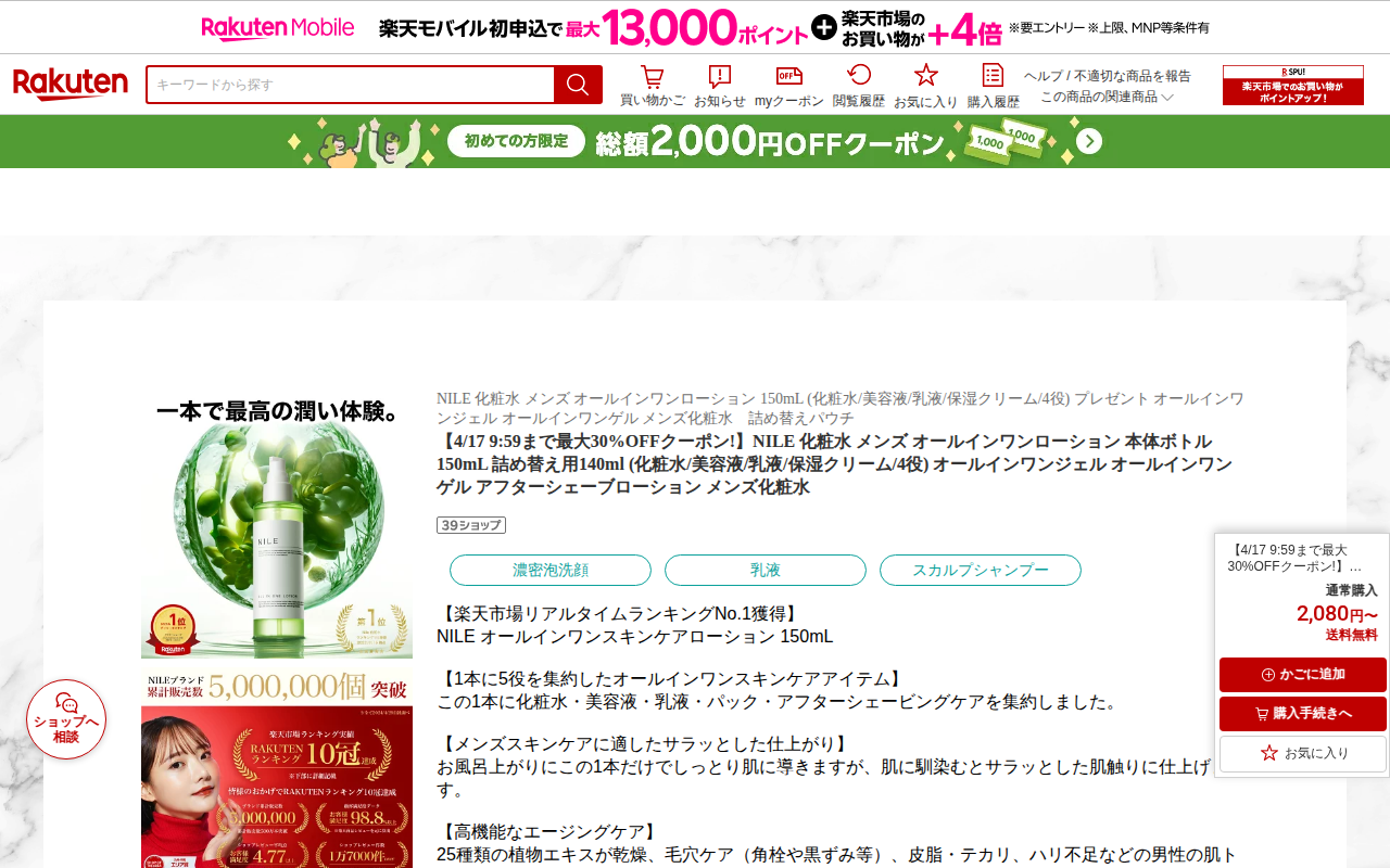 このページはNILEのメンズ用オールインワンローション(150mL)の商品紹介ページです。化粧水・美容液・乳液・パック・アフターシェービングケアの5役を1本に集約した製品で、25種類の植物エキスを配合しています。乾燥や毛...