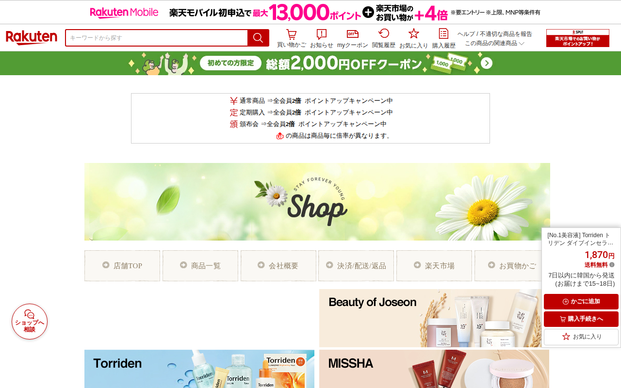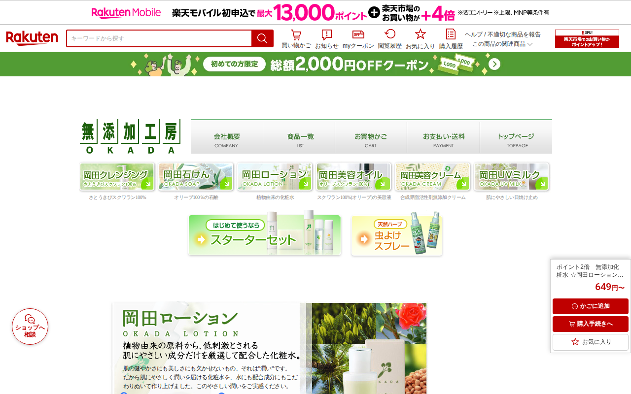 このページは、楽天市場で販売されている無添加化粧水「岡田ローション」の商品紹介ページです。敏感肌用で、植物由来成分のみを使用した低刺激の化粧水で、シミやしわ対策に効果があります。15ml(649円)と200ml(3,96...