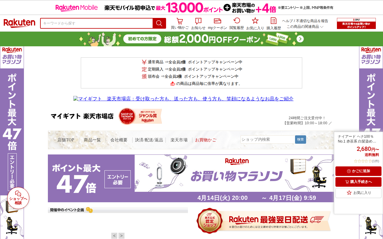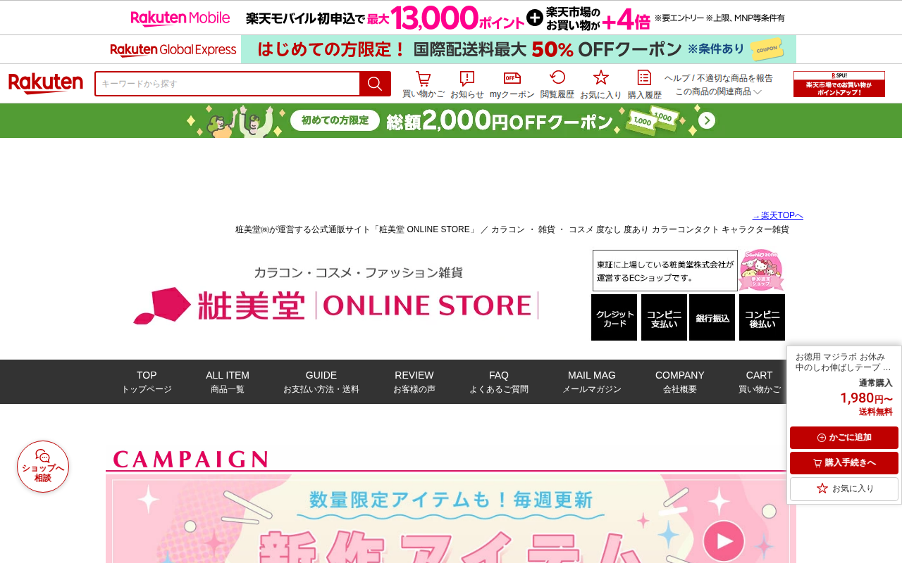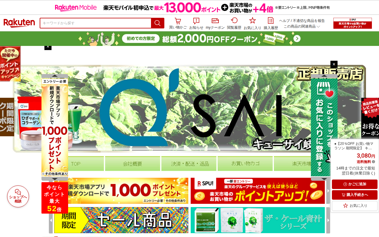 このページはキューサイの「コラリッチ スーパーモイスチャージェル55g」を販売する楽天市場の商品ページです。20%割引のお買い物マラソン期間限定セール中で、価格は3,080円、送料無料です。14時までの注文で最短翌日配送...