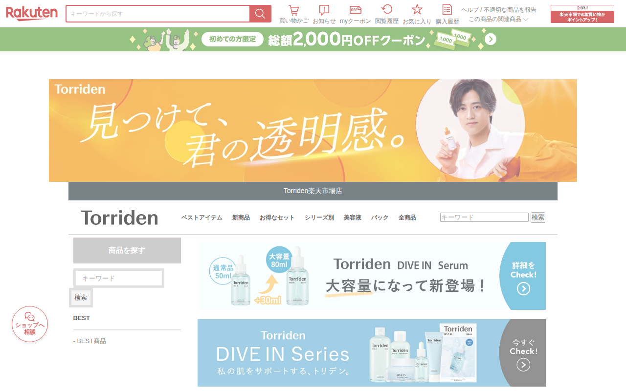 このページは、韓国コスメブランド「Torriden」の「ダイブインセラム」50mlの販売ページです。5D複合低分子ヒアルロン酸配合の水分美容液で、敏感肌向けのニキビケア・赤みケア製品として紹介されています。価格は1,87...
