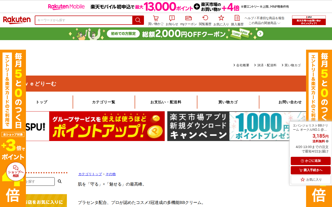 このページはエバンジェリストBBクリーム オークルNO.1の楽天市場での販売ページです。価格は3,185円で送料無料。プラセンタとEGF配合の多機能BBクリームで、@コスメアワード3冠達成。SPF31 PA++の日焼け止...