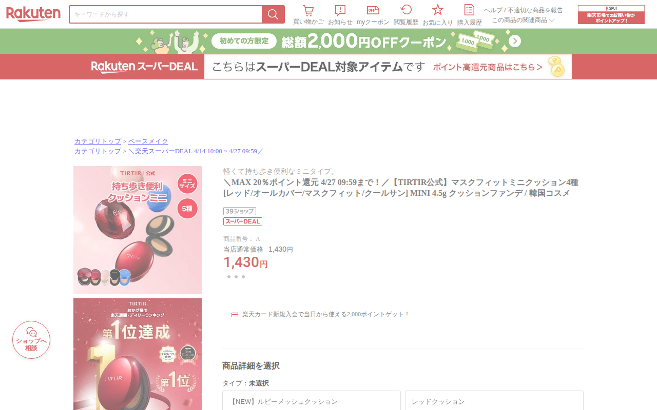 【楽天市場】\MAX 20%ポイント還元 4/27 09:59まで!/【TIRTIR公式】マスクフィットミニクッション4種[レッド/オールカバー/マスクフィット/クールサン] MINI 4.5g クッションファンデ / 韓国コスメ:TIRTIR 楽天市場店