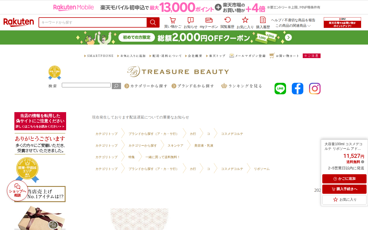 このページは、楽天市場で販売されるコスメデコルテのリポソーム アドバンスト リペアセラムの商品ページです。免税店限定サイズの大容量100mlで、11,527円(送料無料)で販売されています。超微細なマイクロカプセルを含む...