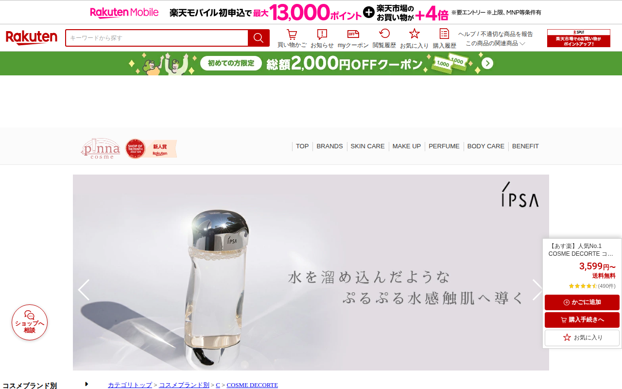このページは、楽天市場で販売されているコスメデコルテの人気No.1ルースパウダーの商品ページです。3,599円から4,030円の価格帯で、複数のカラーバリエーション(translucent、crystal translu...